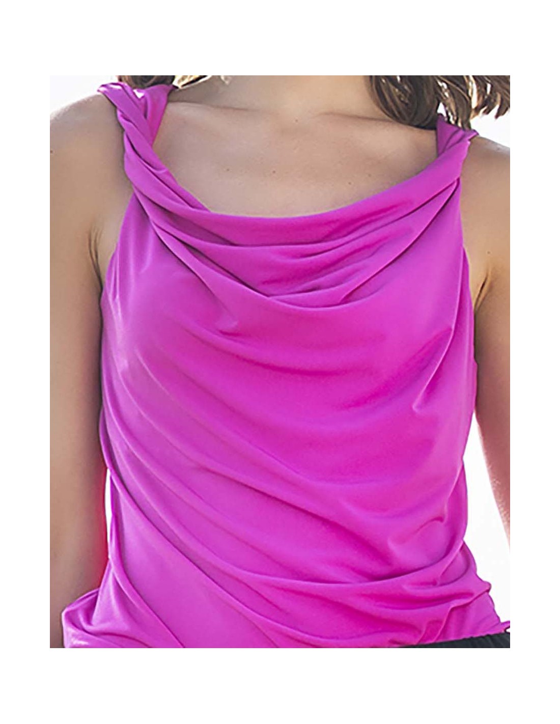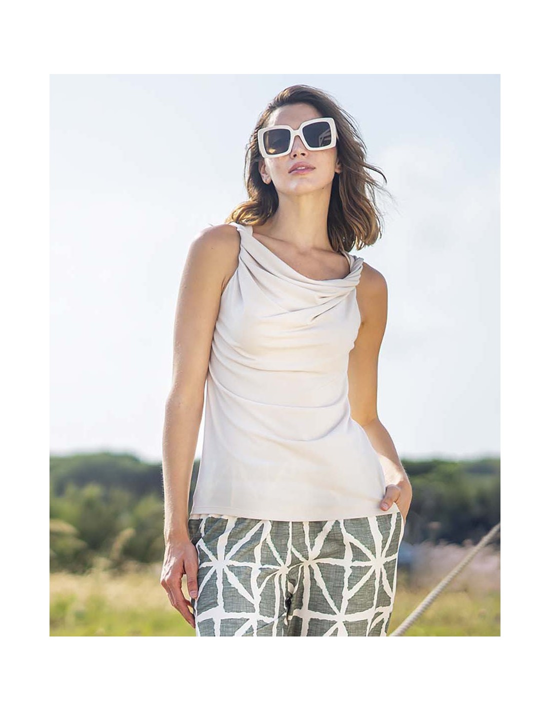 Camiseta de mujer sin mangas de tejido de punto suave y cómodo. Presenta un escote drapeado que añade un toque de suavidad y fluidez al diseño. Este diseño con gran variedad de colores a elegir es ideal para noches de verano formales o informales, donde se desea lucir un look chic.