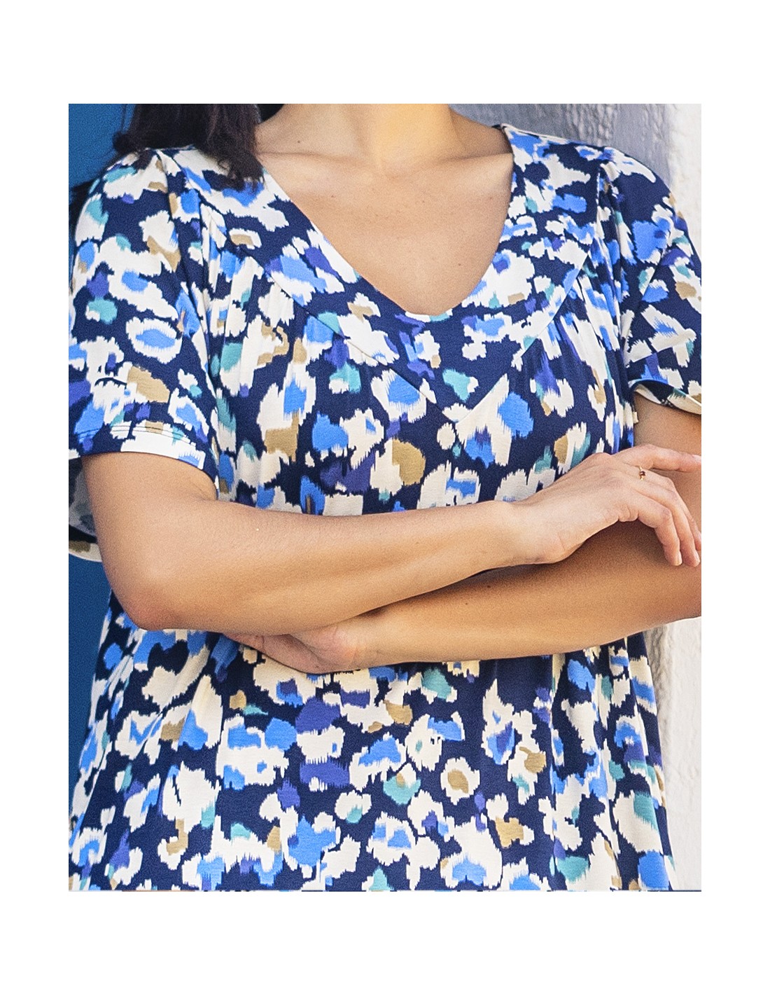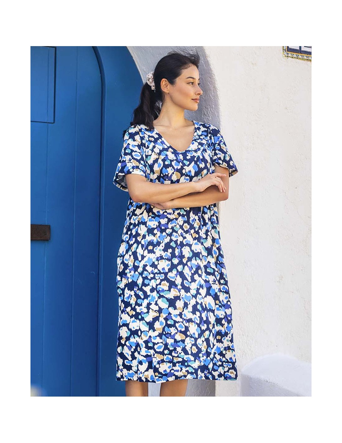 Este vestido de manga corta combina la frescura de un corte cómodo con la originalidad de un estampado tipo acuarela, en tonos azul, beige, verde y negro. Su abertura frontal con botones aporta practicidad y estilo, mientras que los bolsillos laterales lo hacen perfecto para el uso diario. Una prenda versátil, moderna y única, ideal para mujeres que...