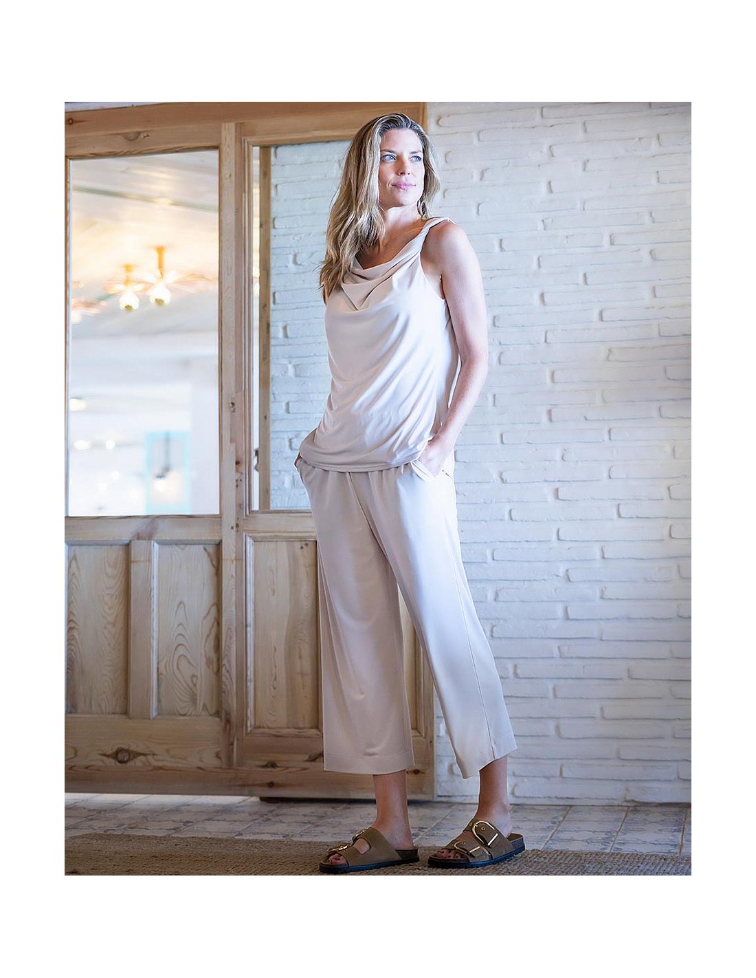 Samarreta de dona sense mànigues de teixit de punt suau i còmode. Presenta un escot drapejat que afegeix un toc de suavitat i fluïdesa al disseny. Aquest disseny amb gran varietat de colors a escollir és ideal per a nits d'estiu formals o informals, on es vol lluir un look xic.