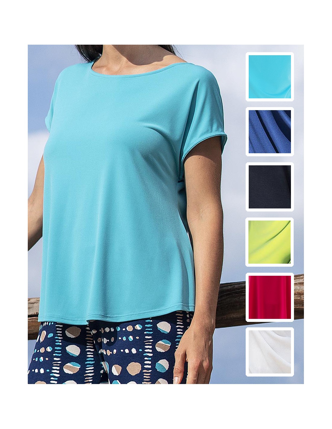 Camiseta de mujer con manga corta japonesa y cuello barco,de tejido de punto suave y cómodo. Corte holgado para más comodidad. Este diseño con gran variedad de colores a elegir es ideal para noches de verano formales o informales, donde se desea lucir un look chic. Combina con los pantalones de la misma colección.