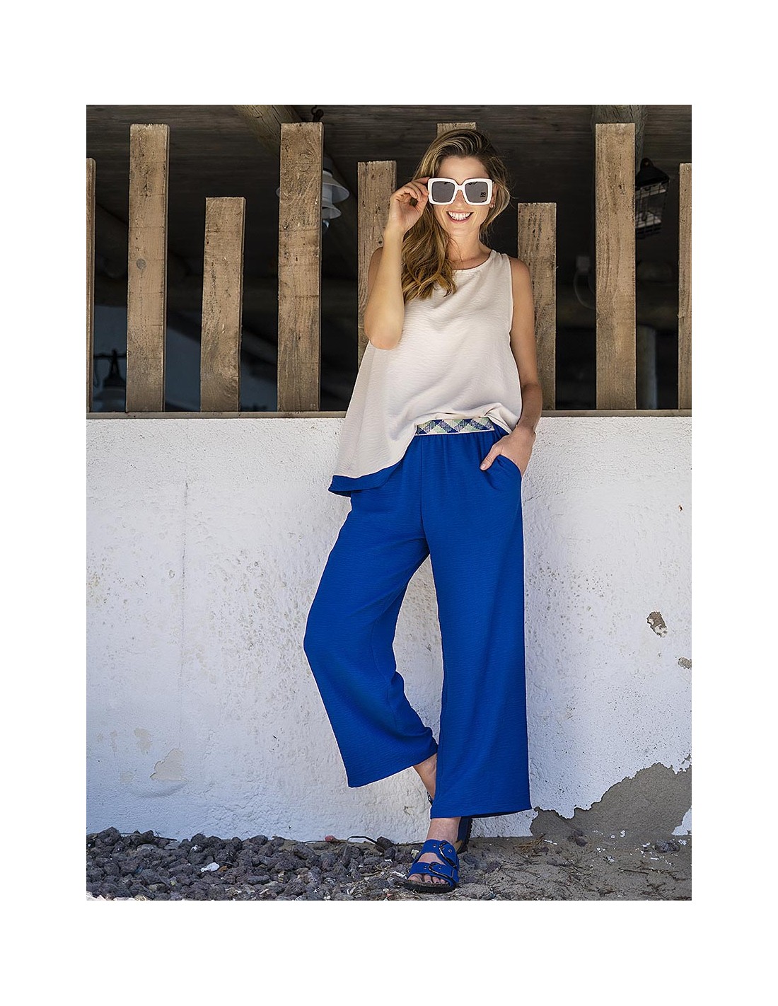 Este elegante pantalón de largo 3/4 es una opción moderna y versátil para cualquier guardarropa. Este pantalón es perfecto para una apariencia sofisticada. La cintura elástica presenta un estampado geométrico en tonos verde y azul, proporcionando un