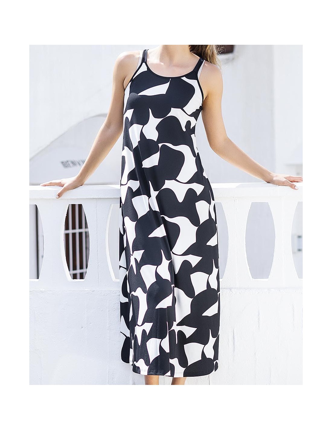 Vestido de punto de crep estampado, con tirantes estrechos lisos, Largo 130 cm.