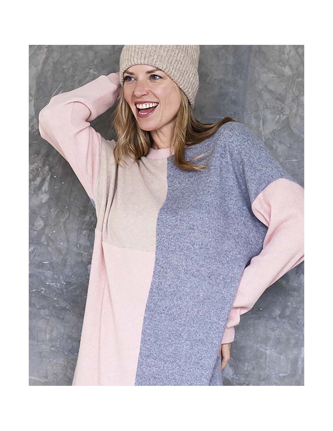 Descubre la combinación perfecta de confort y estilo con esta camisola de punto bicolor. Su diseño único divide la prenda en dos bloques de color contrastantes, aportando un toque moderno y elegante que la convierte en una pieza especial para tu armario.Confeccionada en un tejido de punto suave y cálido, esta camisola es ideal para los días frescos, ofreciéndote comodidad sin sacrificar estilo. Su corte relajado y mangas largas garantizan una sensación acogedora y libertad de movimiento, perfecta para usar en casa o para crear un look casual con un toque sofisticado.