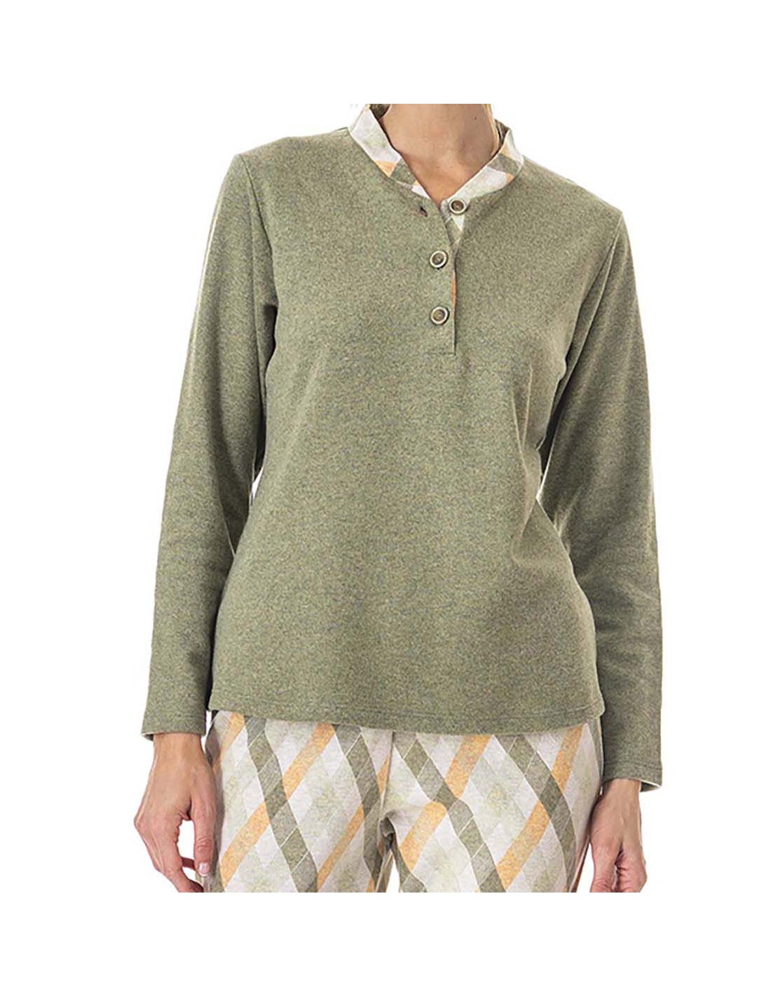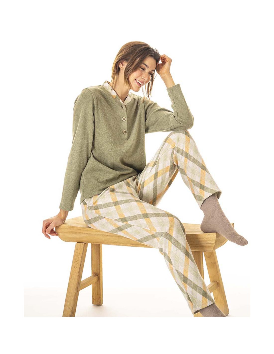Este pijama está confeccionado completamente en punto Milano, ofreciendo suavidad, calidez y una estructura cómoda para el descanso. La camiseta de manga larga presenta un diseño liso y texturizado, con cuello redondo, tapeta y botones, aportando un estilo práctico y elegante. El pantalón, a juego, destaca por su estampado de cuadros diagonales en tonos cálidos y suaves, que contrastan armónicamente con la parte superior. Este conjunto es perfecto para disfrutar de tus momentos de relax con comodidad y buen gusto.