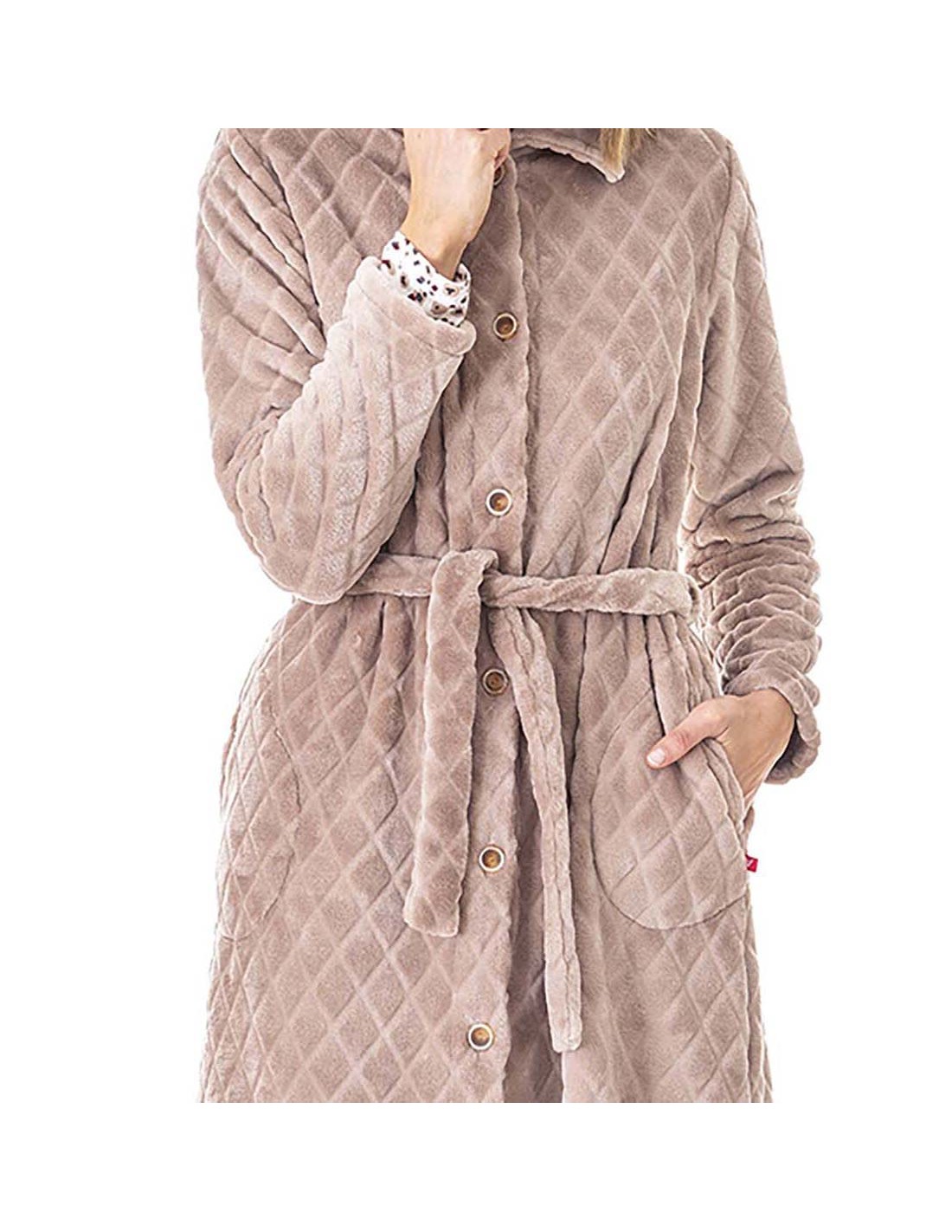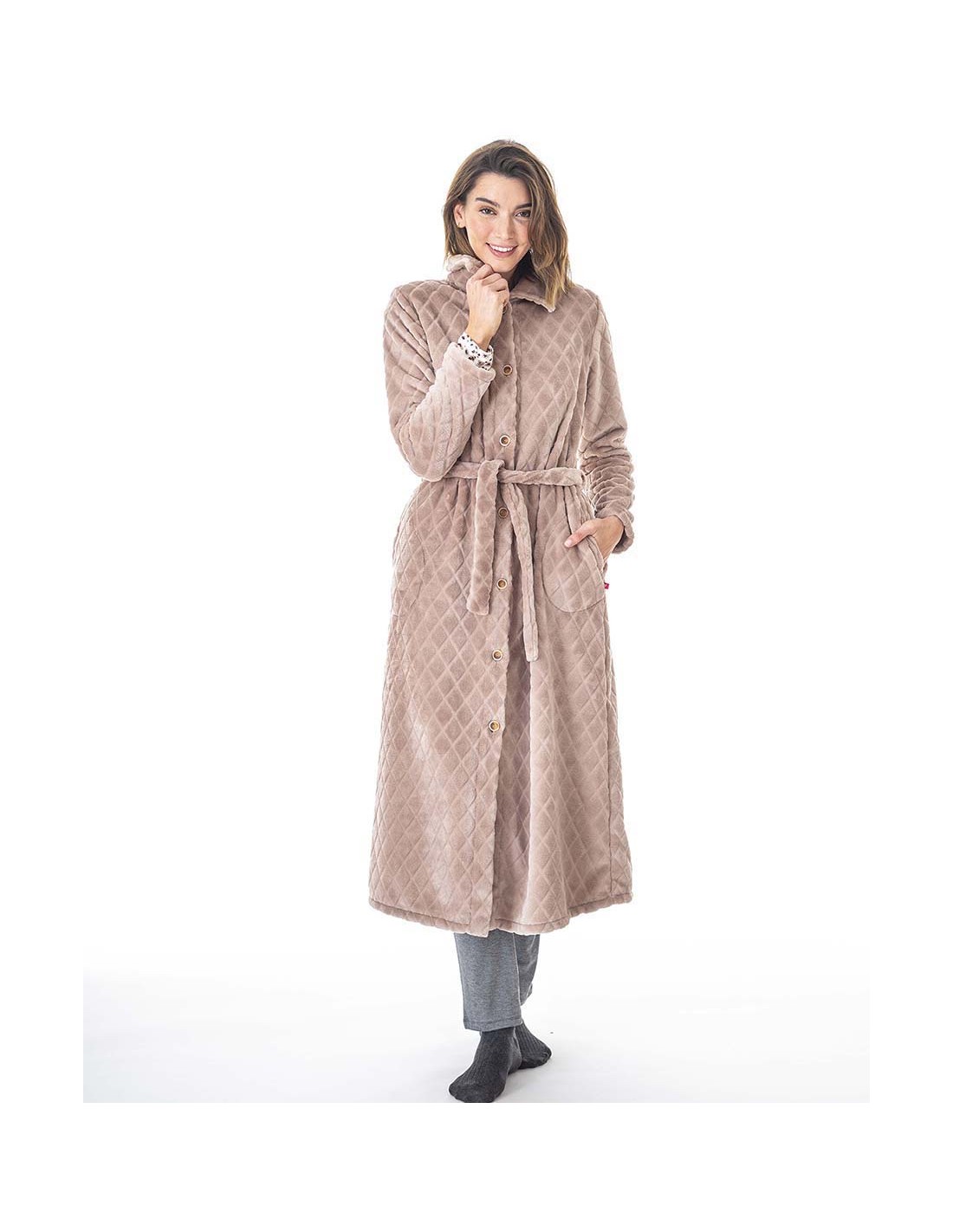 Con una longitud de 1.30 metros, esta bata destaca por su comodidad, calidez y diseño sofisticado. Confeccionada en pelo aterciopelado, su textura suave y lujosa es perfecta para los días fríos.El diseño presenta un elegante relieve de rombos que le da un toque refinado, y cuenta con una apertura delantera con botones, que facilita su uso y aporta funcionalidad. Los bolsillos laterales son un detalle práctico para mantener tus manos cálidas o guardar pequeños objetos. Además, incluye un cinturón ajustable que permite personalizar el ajuste según tus preferencias.