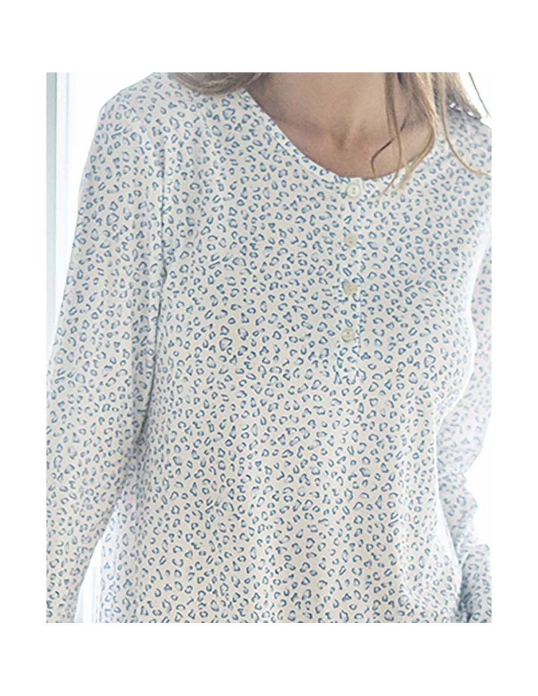 Este camisón de manga larga combina diseño clásico y comodidad para un descanso placentero. Con un cuello redondo y una tapeta frontal que le añade un detalle elegante, esta prenda destaca por su delicado estampado con dibujo de mini piel en tonos sutiles, ideal para quienes buscan un look sofisticado para el hogar. Su confección con materiales suaves y...