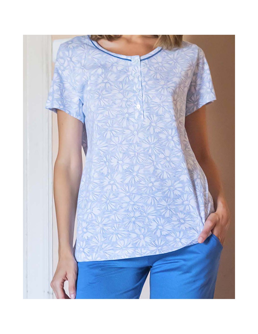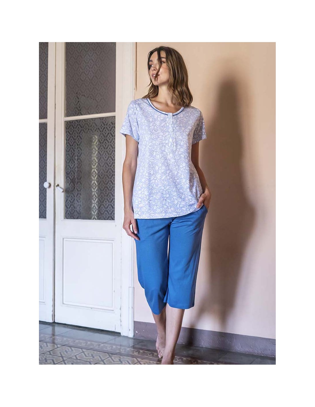 Disfruta de la suavidad y frescura de nuestro pijama de algodón modal, ideal para tus momentos de descanso. Con un delicado estampado floral en tonos azules y diseño de manga corta, esta prenda te ofrece libertad de movimiento y elegancia sin esfuerzo. Pantalón largo 3/4 liso y bolsillos, con cintura ajustable con goma. Perfecto para el hogar o una noche de descanso reparador.