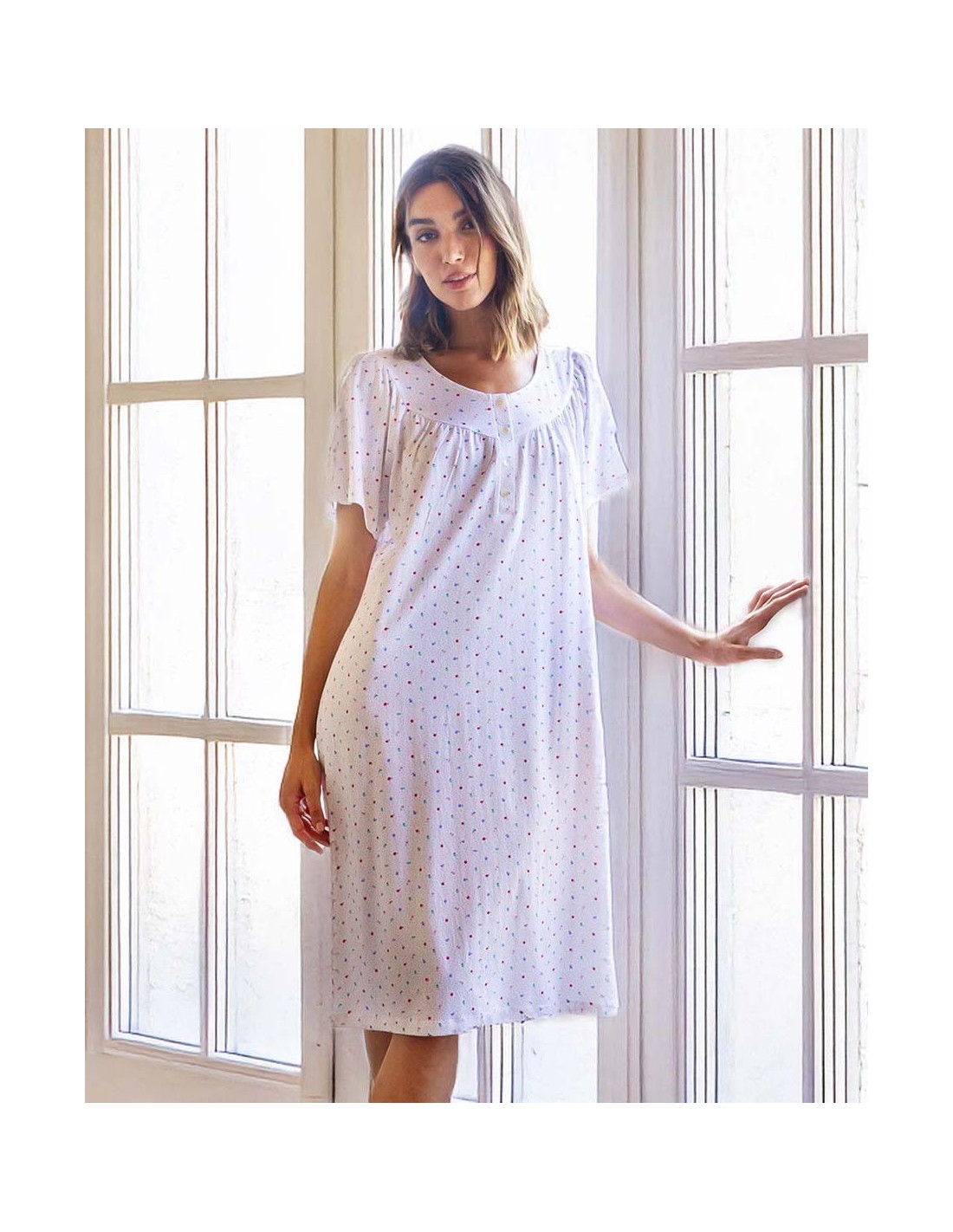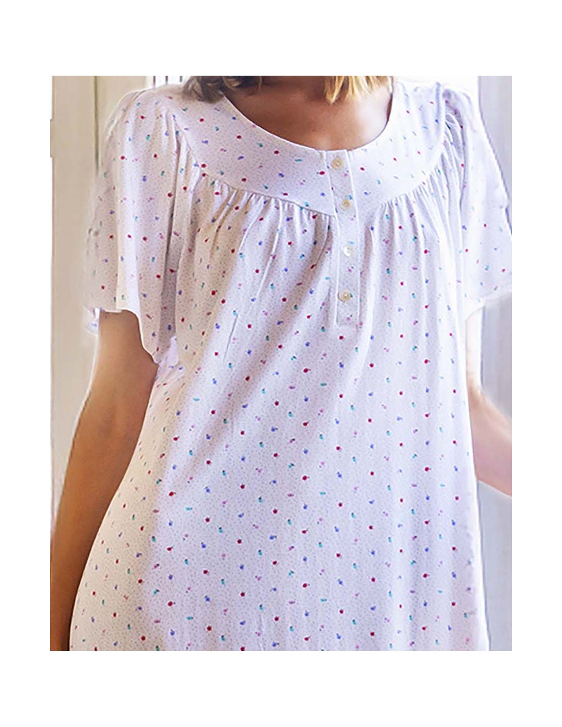 Camisón clásico de punto de algodón modal estampada con motivos de flores y mini topitos de manga corta, cuello redondo con tapeta abotonada con canesú que da más amplitud y comodidad. Perfecto para dormir o para momentos de descanso, proporcionando suavidad y comodidad gracias a su material de alta calidad.