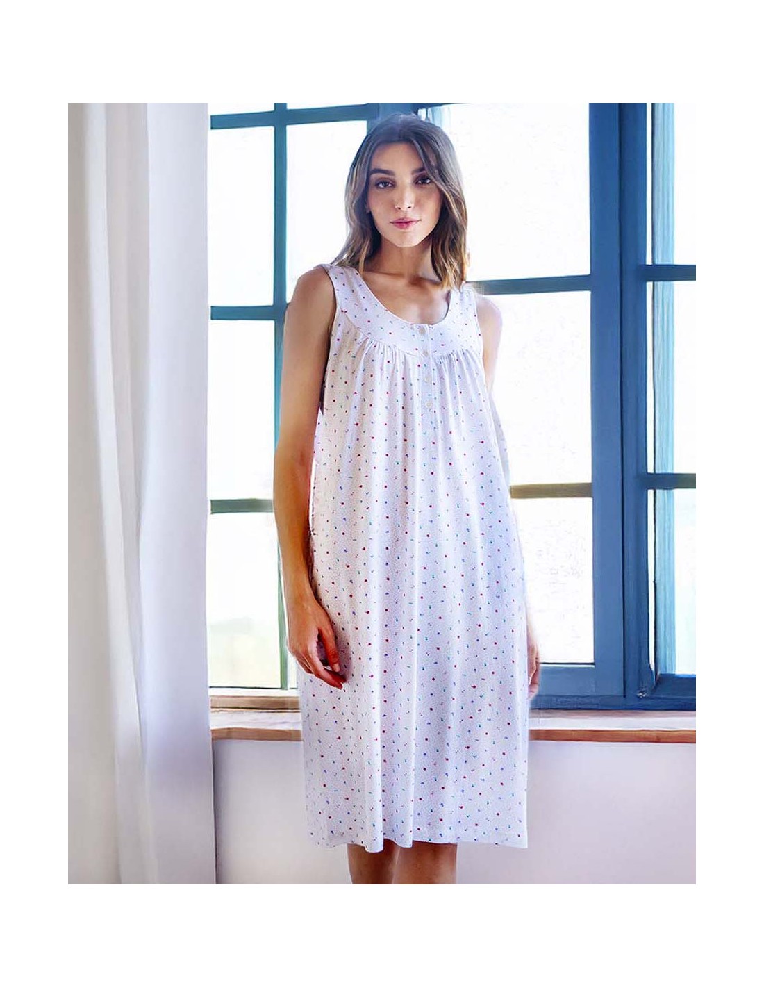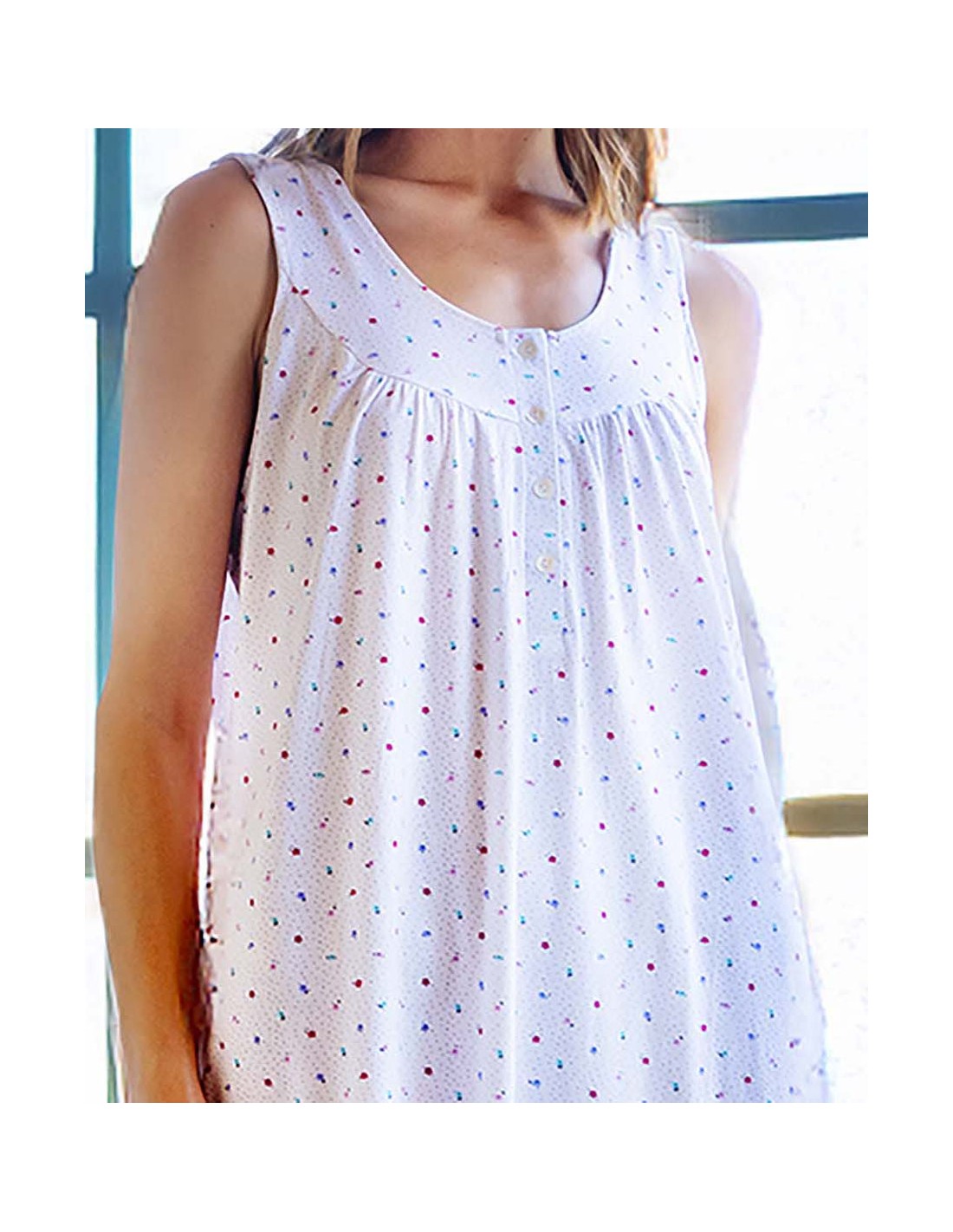 Camisón clásico de punto de algodón modal estampada con motivos de flores y mini topitos sin manga, cuello redondo con tapeta abotonada con canesú que da más amplitud y comodidad. Perfecto para dormir o para momentos de descanso, proporcionando suavidad y comodidad gracias a su material de alta calidad.