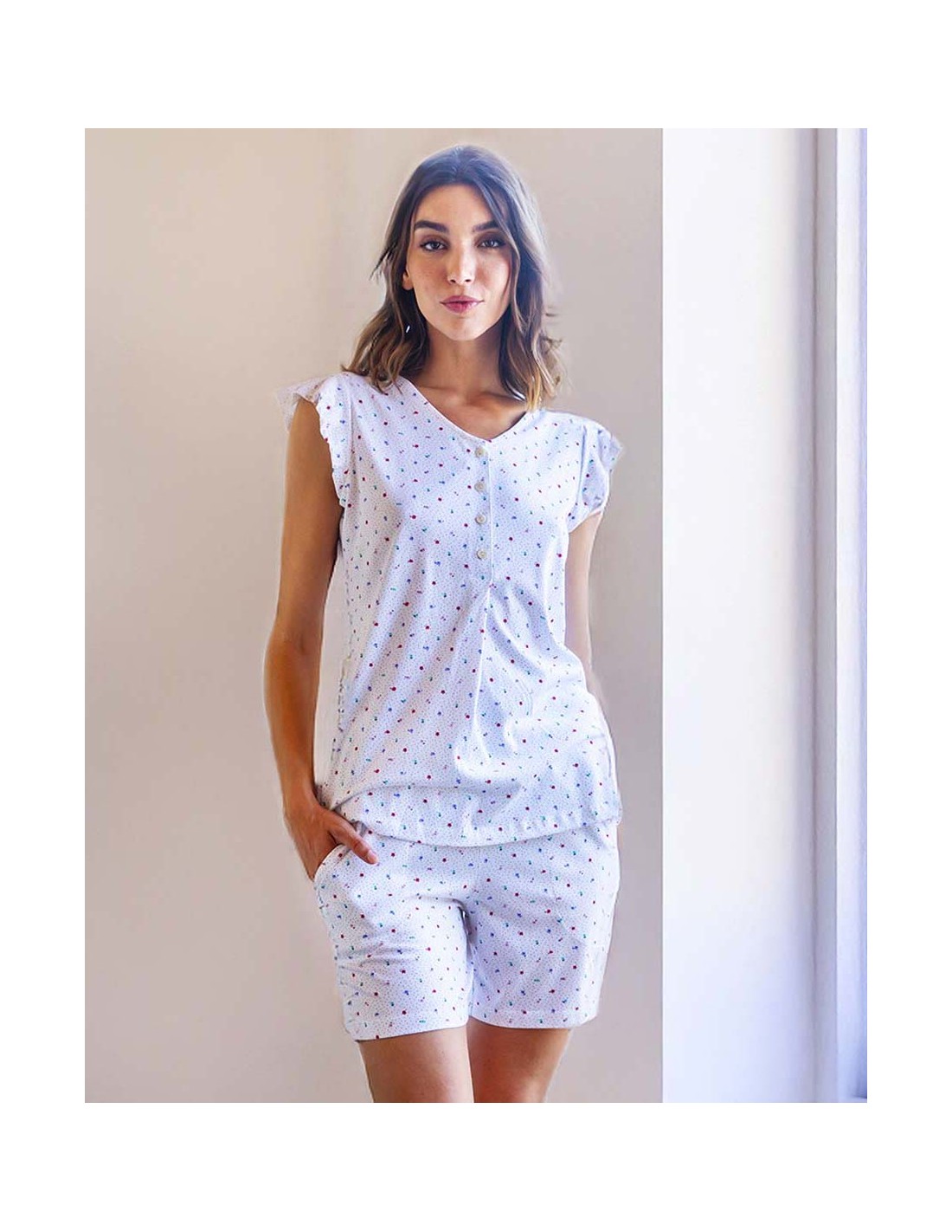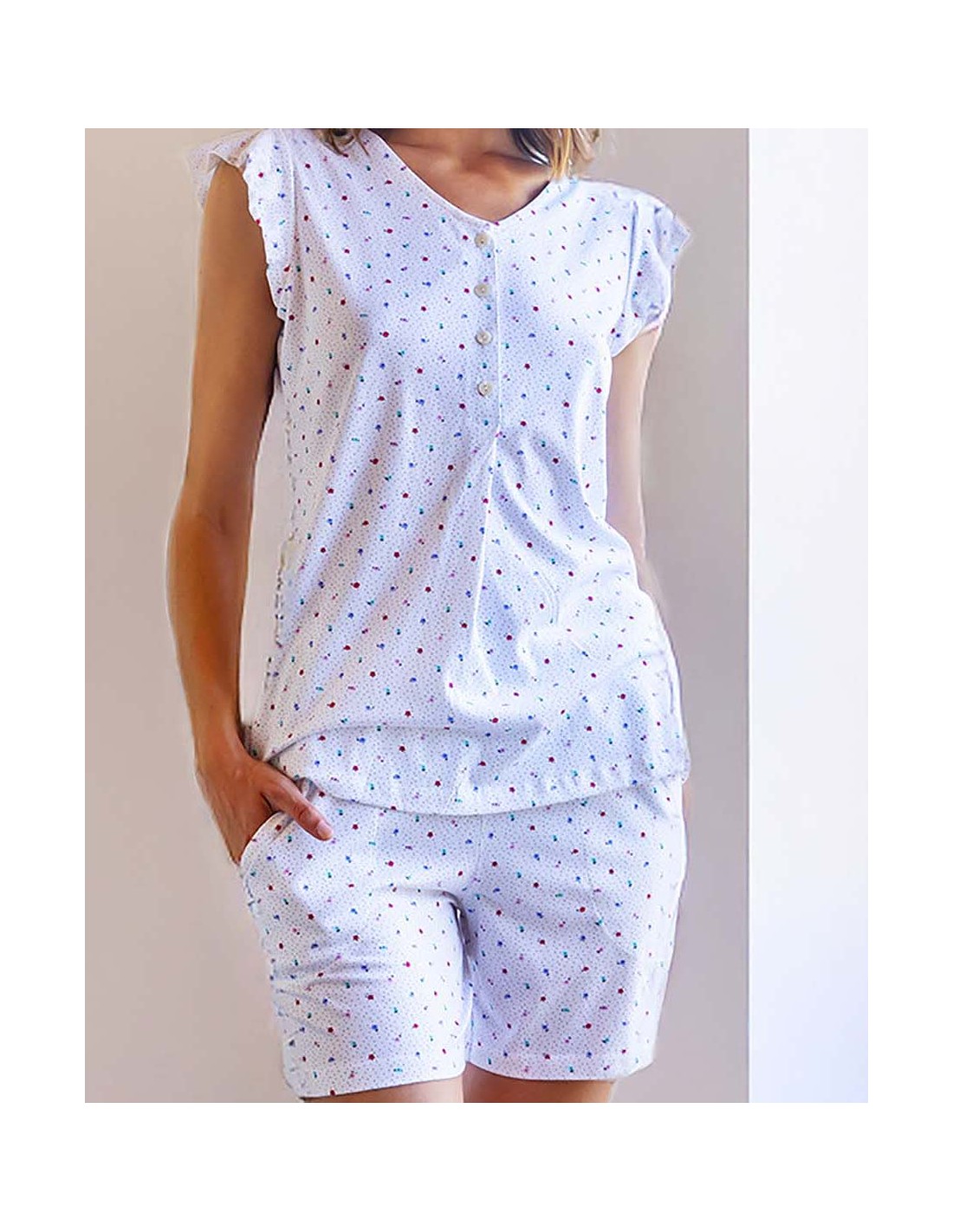 Camisón clásico de punto de algodón modal estampada con motivos de flores y mini topitos de manga corta, cuello redondo con tapeta abotonada con canesú que da más amplitud y comodidad. Perfecto para dormir o para momentos de descanso, proporcionando suavidad y comodidad gracias a su material de alta calidad.
