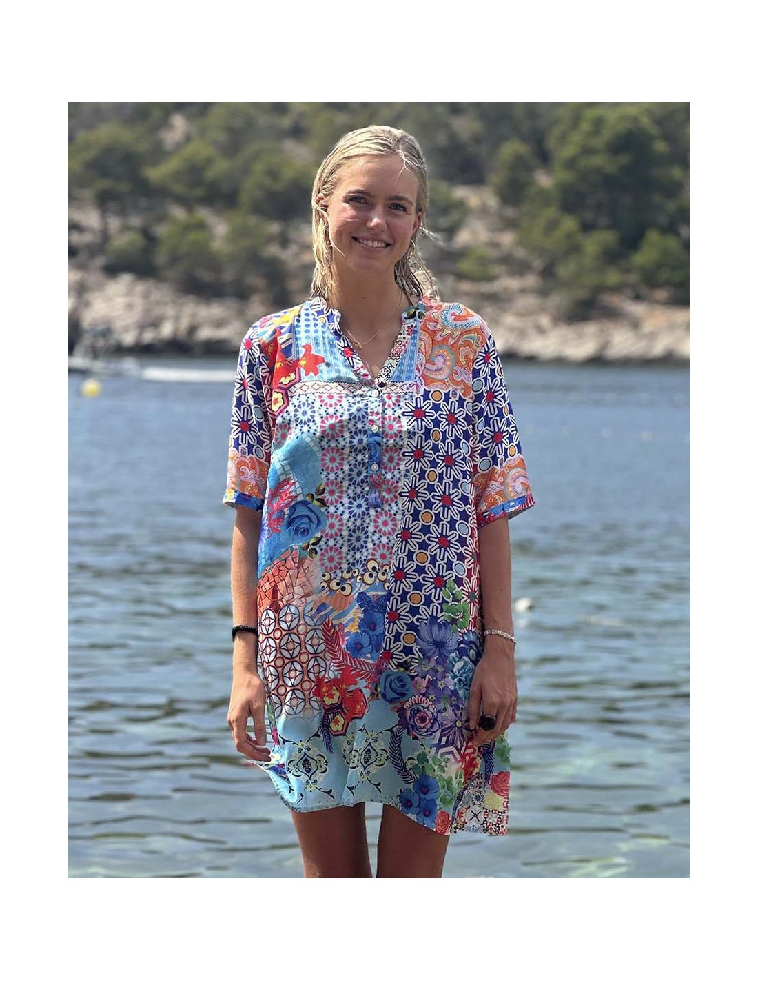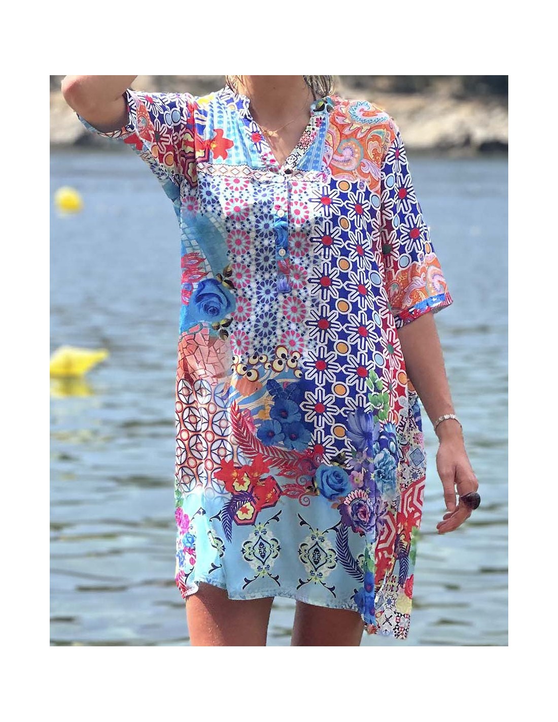 Atrévete a destacar con nuestra túnica de viscosa estampada, una prenda única que fusiona la elegancia con la energía de los colores vibrantes. Su diseño inspirado en motivos geométrico te transportará a destinos exóticos, mientras que su corte holgado y fluido te permitirá moverte con libertad y comodidad. Confeccionada en suave viscosa, esta túnica es perfecta para los días más calurosos del verano. Ideal para la playa, festivales, eventos al aire libre o para añadir un toque bohemio a tus looks diarios.