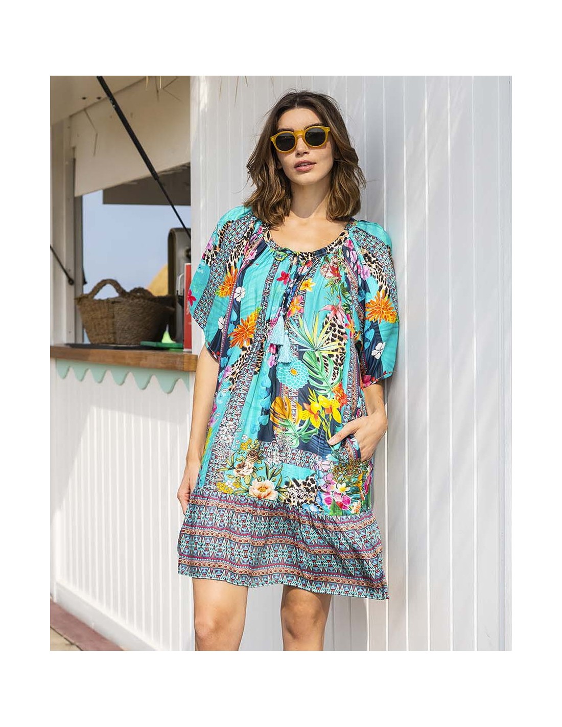 Eleva tu estilo veraniego con nuestra túnica playera de viscosa, una prenda que combina la comodidad con la energía de los colores vibrantes. Su diseño exclusivo presenta un estampado bohemio multicolor con flores, hojas y figuras geométricas, creando un efecto visualmente impactante y lleno de vida. Confeccionada en suave viscosa, esta túnica te envolverá en frescura y te permitirá moverte con libertad y gracia. El cuello redondo ajustable con cordón te permite personalizar el escote según tu estilo y preferencia.