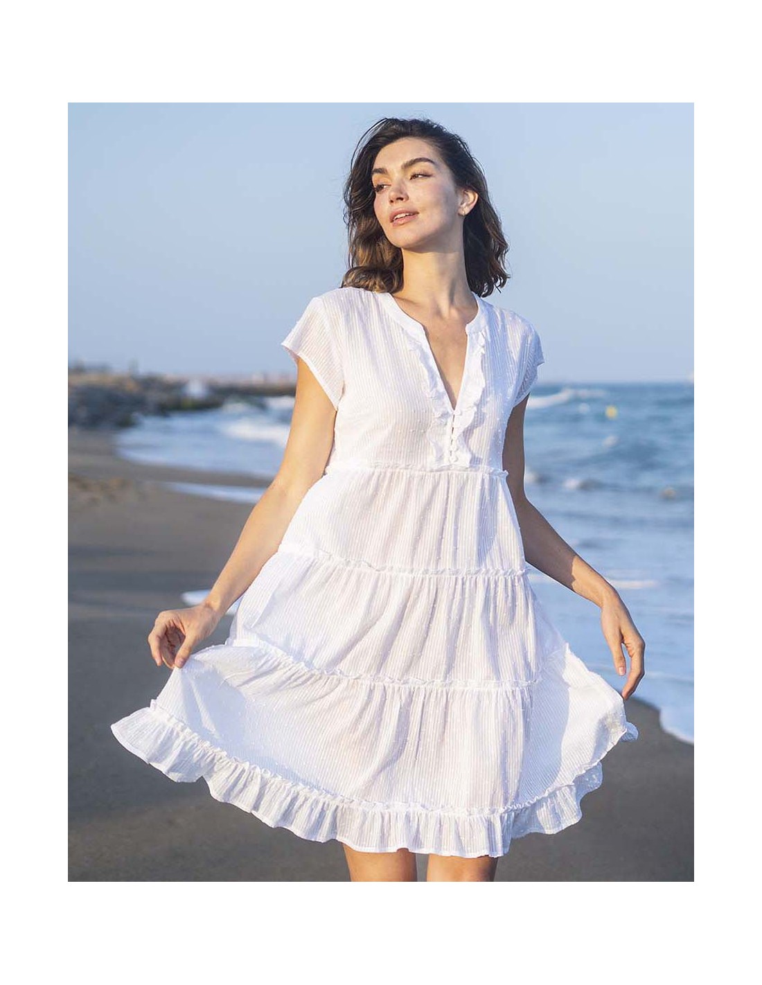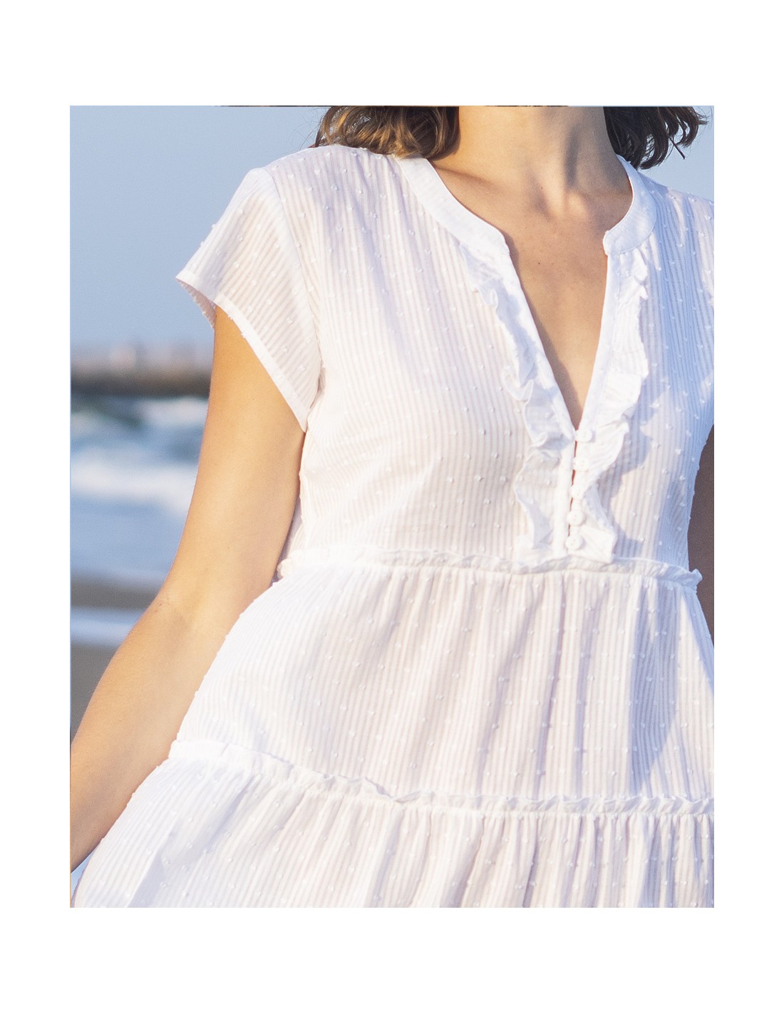 Este modelo de vestido con mangas 3/4, con botones al frente y escote en forma de V, está disponible en tres colores vibrantes: blanco,lago,papaya.Confeccionado en batista ligera y transpirable, este vestido presenta un sutil plumeti que añade un toque de sofisticación. Además, el escote está adornado con tablas que aportan un estilo único y elegante.Este...