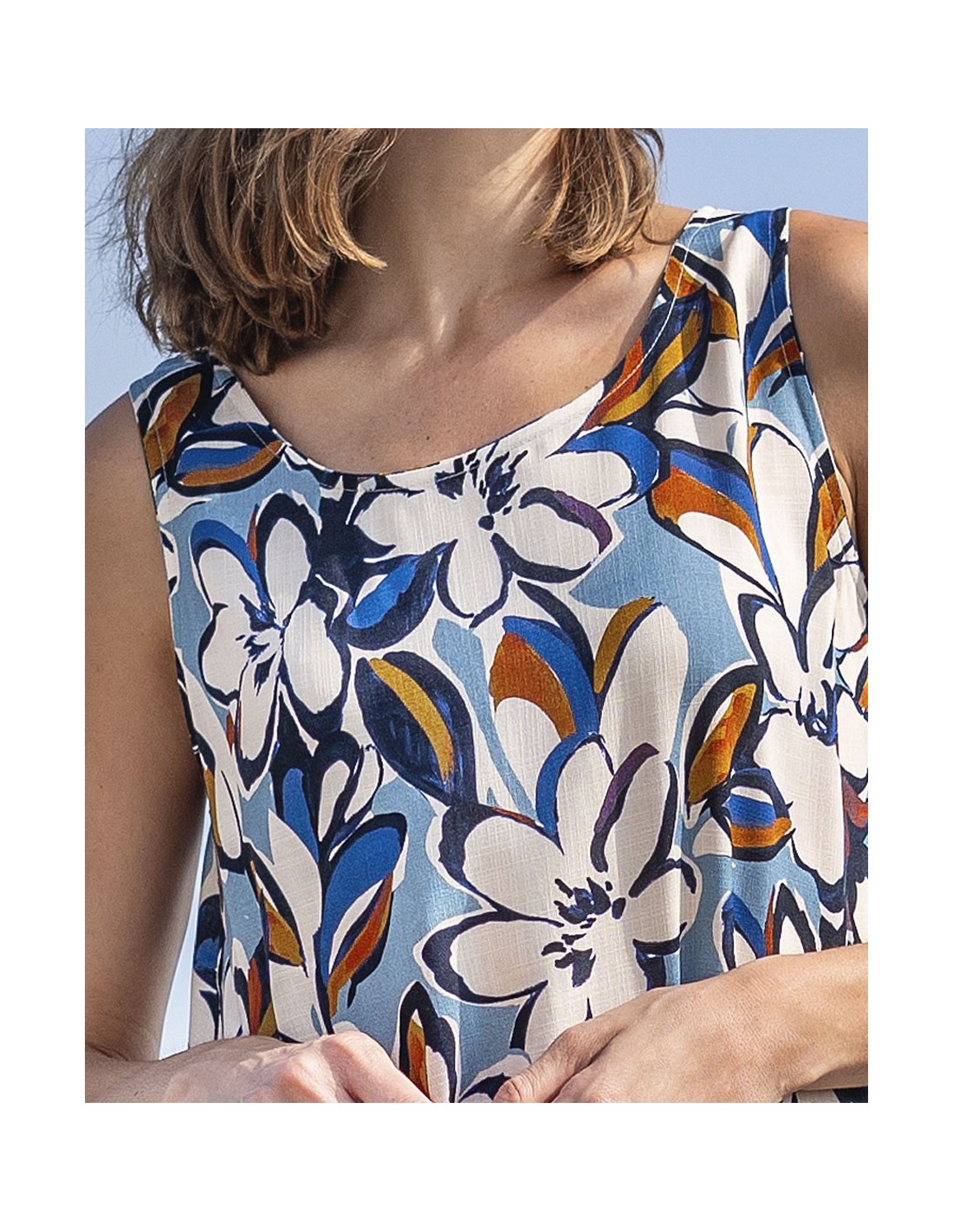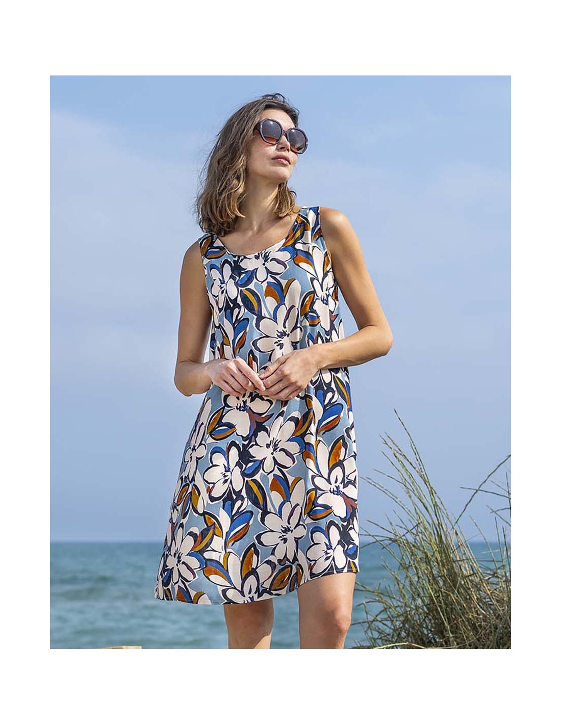 Vestido casual con tirante ancho un vibrante estampado floral en tonos azul, marrón y blanco. Su diseño con tirante ancho aporta comodidad y frescura, ideal para lucir fresca y con estilo durante los días soleados.