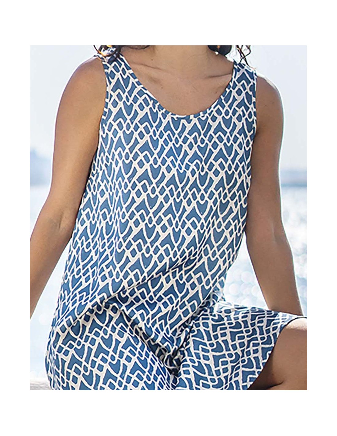 Destaca con elegancia y simplicidad con este sofisticado vestido de tirantes confeccionado en suave raso estampado. Su diseño de líneas geométricas en tonos azul petroleo y blanco ofrece un toque moderno y chic, perfecto para cualquier ocasión especial o una salida casual con estilo. El escote redondo y los tirantes anchos proporcionan un ajuste cómodo y favorecedor, mientras que la caída fluida del vestido asegura un look relajado y elegante. La tela de raso añade un brillo sutil y una textura lujosa que realza el atractivo del diseño.