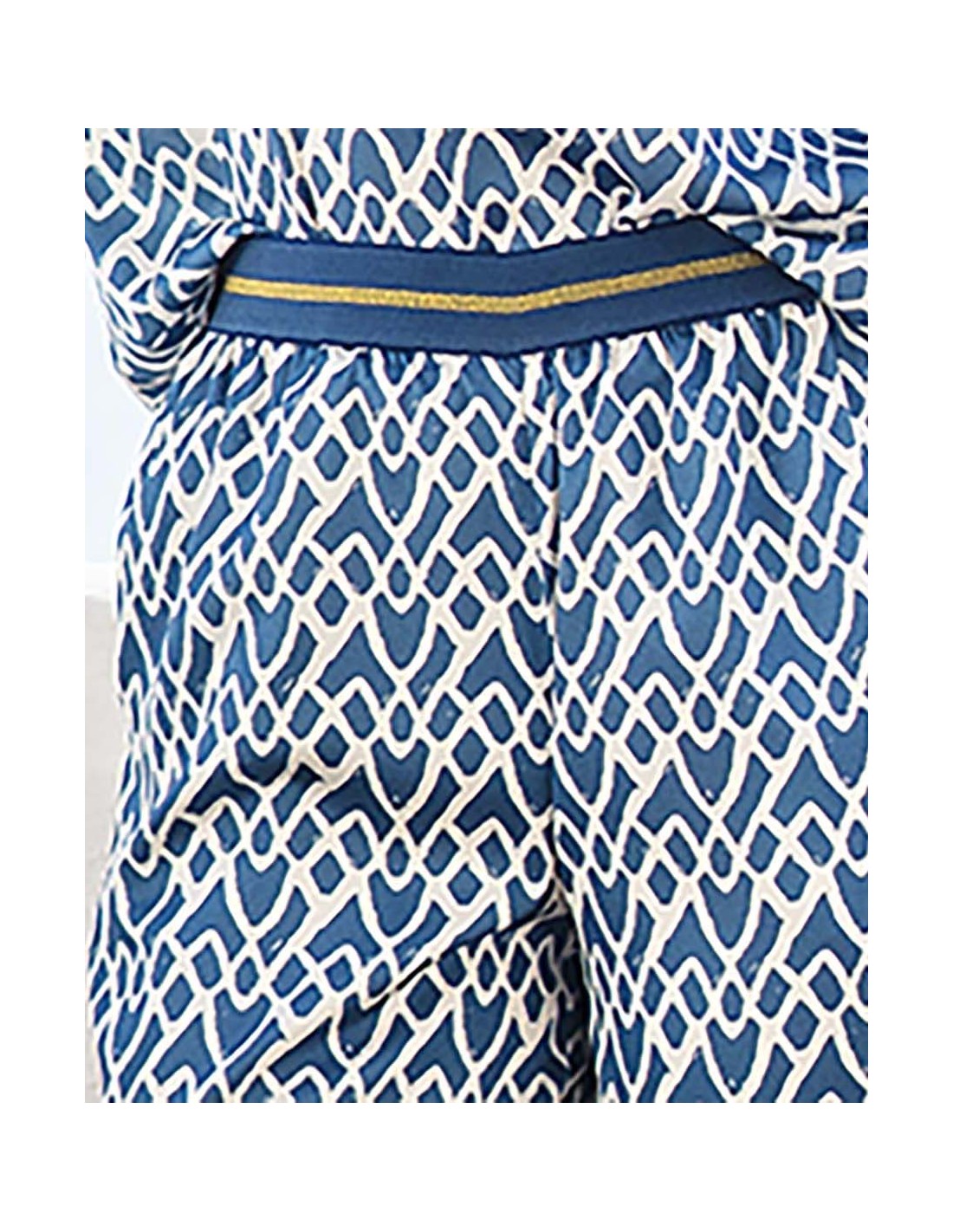 Destaca con elegancia y simplicidad con este sofisticado pantalón confeccionado en suave raso estampado. Su diseño de líneas geométricas en tonos azul petroleo y blanco ofrece un toque moderno y chic, perfecto para cualquier ocasión especial o una salida casual con estilo. Este pantalón destaca por su cintura elástica decorativa de fantasía, el corte holgado y la caída suelta perfecto para diversas ocasiones que asegura un look relajado y elegante. La tela de raso añade un brillo sutil y una textura lujosa que realza el atractivo del diseño.