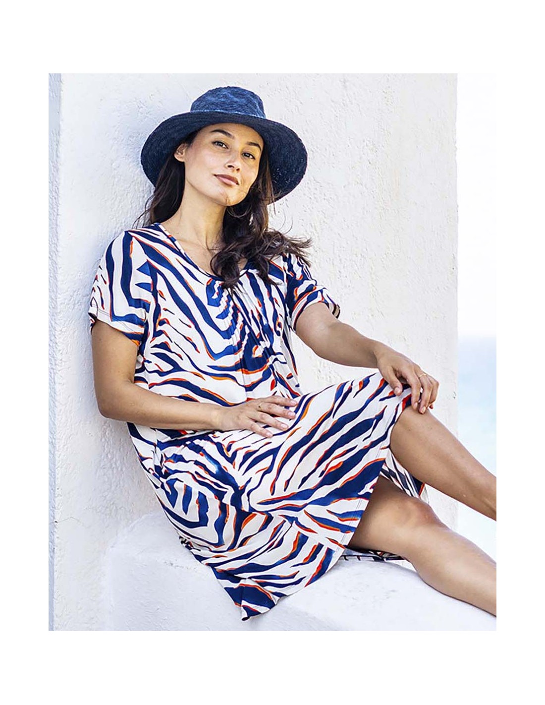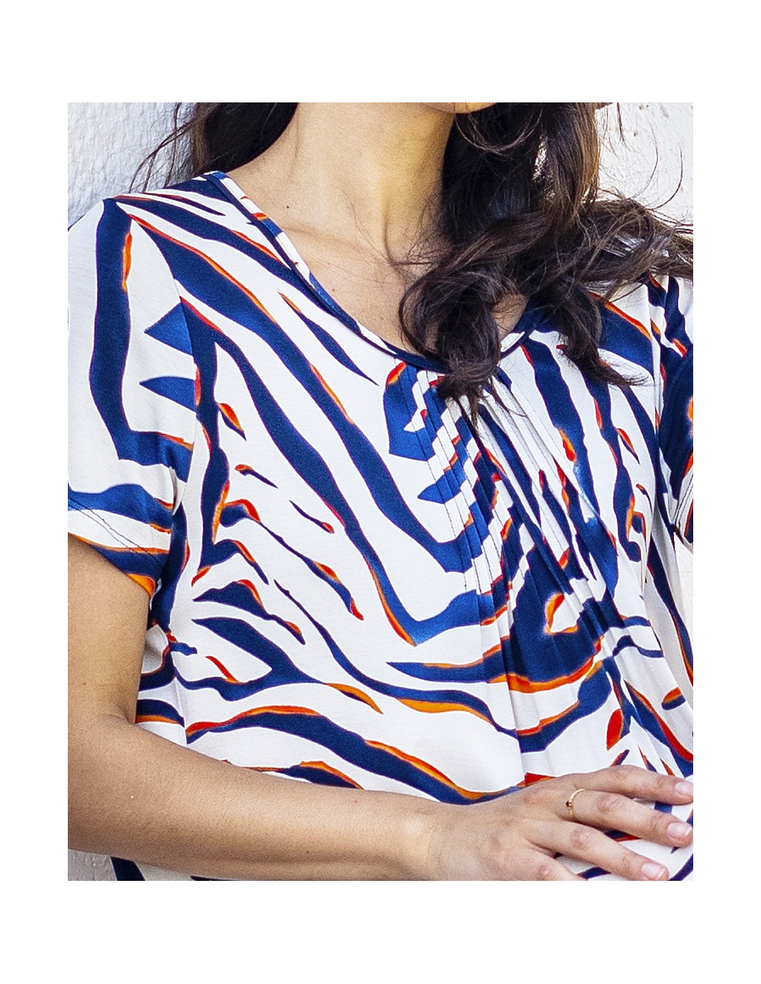 Luce fresca y con total libertad de movimiento con esta playera en estampado simétrico en tonos intensos, diseñada para brindarte confort sin perder el estilo. Su diseño sencillo se realza con tablas decorativas en el frente, que no solo aportan un toque original, sino que también dan amplitud y caída a la prenda.