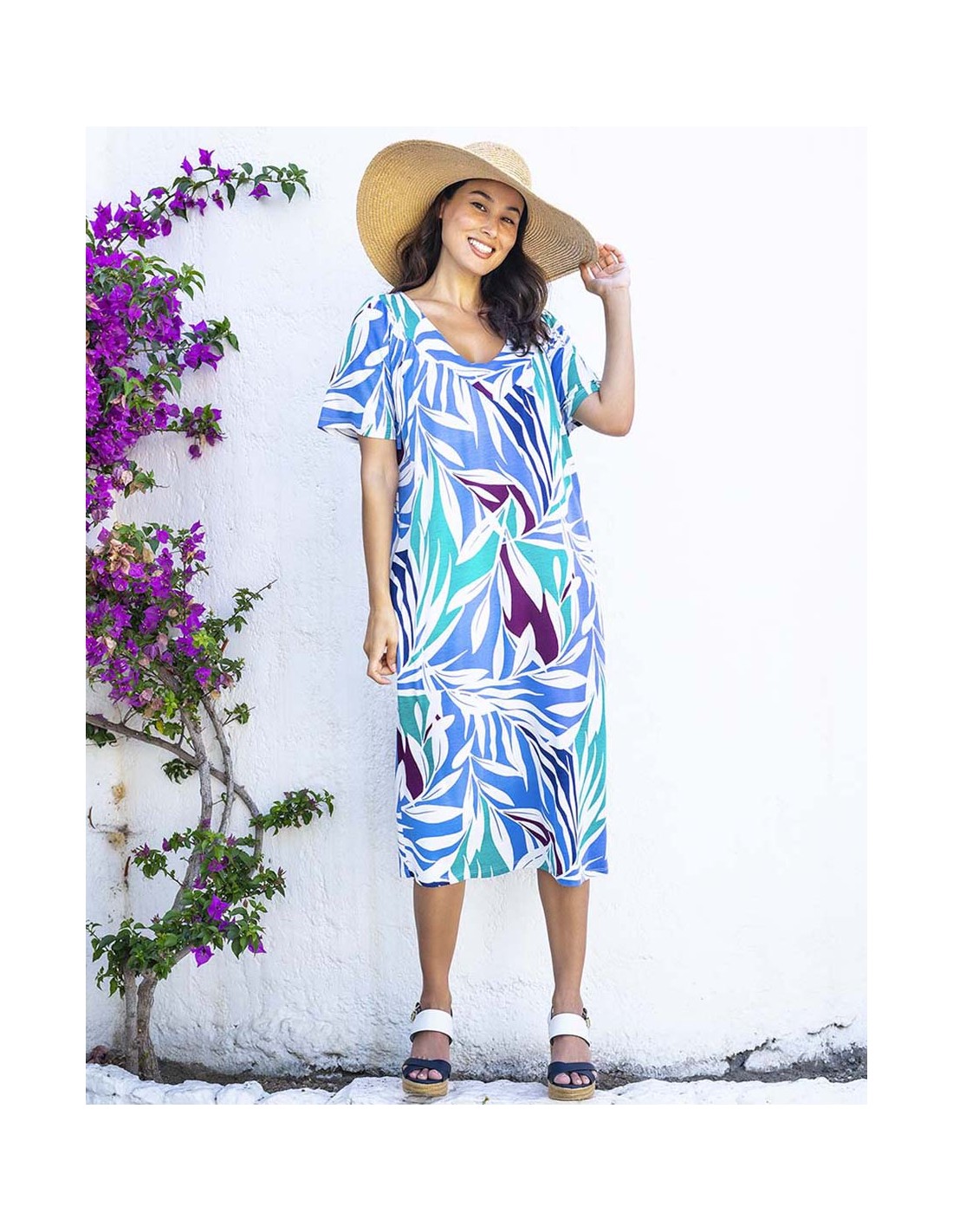 Vestido clásico de punto estampado. Modelo de manga corta, escote en pico con canesú desde donde nacen unas lorzas que le dan amplitud, sobre todo en tallas más grandes. Detalle de bolsillos interiores laterales pespuntados. Tejido muy fresco, ligero y suave con estampado floreal.