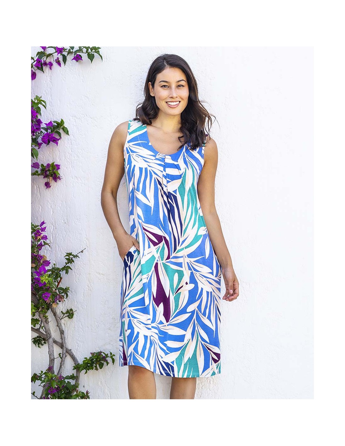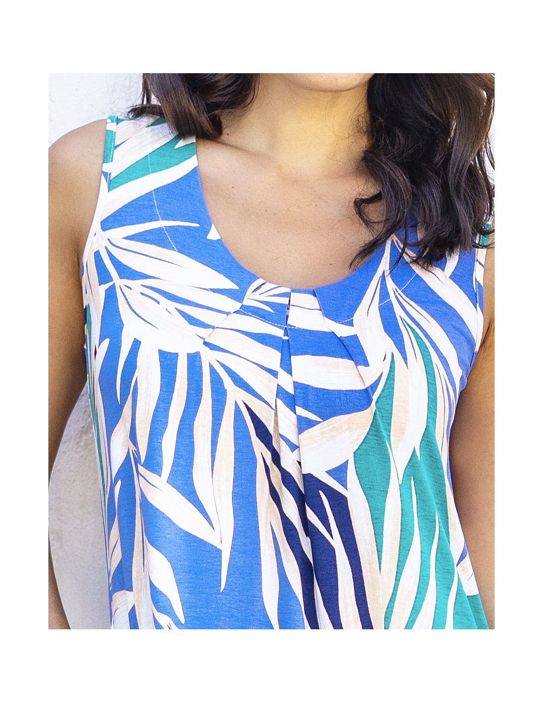 Este elegante vestido está confeccionado en una mezcla suave y elástica de viscosa y licra, proporcionando comodidad y un ajuste perfecto. El diseño destaca por un atractivo estampado floreal, que añade un toque moderno y vibrante. Los pliegues en el escote no solo ofrecen un detalle distintivo y sofisticado, sino que también aportan amplitud, realzando la silueta de manera favorecedora. El vestido sin mangas total frescura, ideal para cualquier ocasión casual.