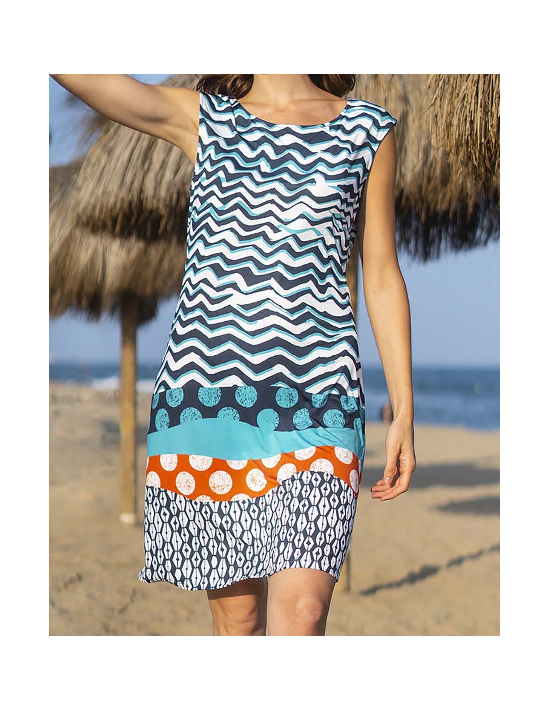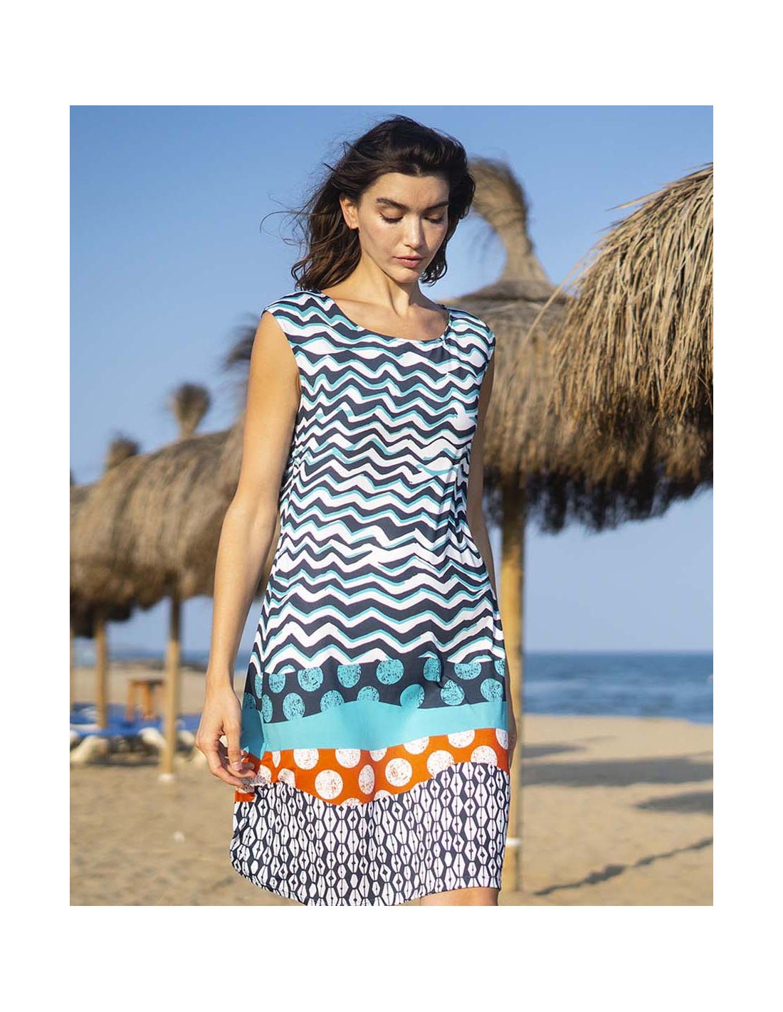 Este vestido midi con hombro caido luce un divertido estampado de ondas en tonos azul, blanco, turquesa y detalles en coral, evocando el espíritu del mar. Su diseño recto y escote barco brindan una silueta cómoda y favorecedora, ideal para un look fresco y moderno en climas cálidos.