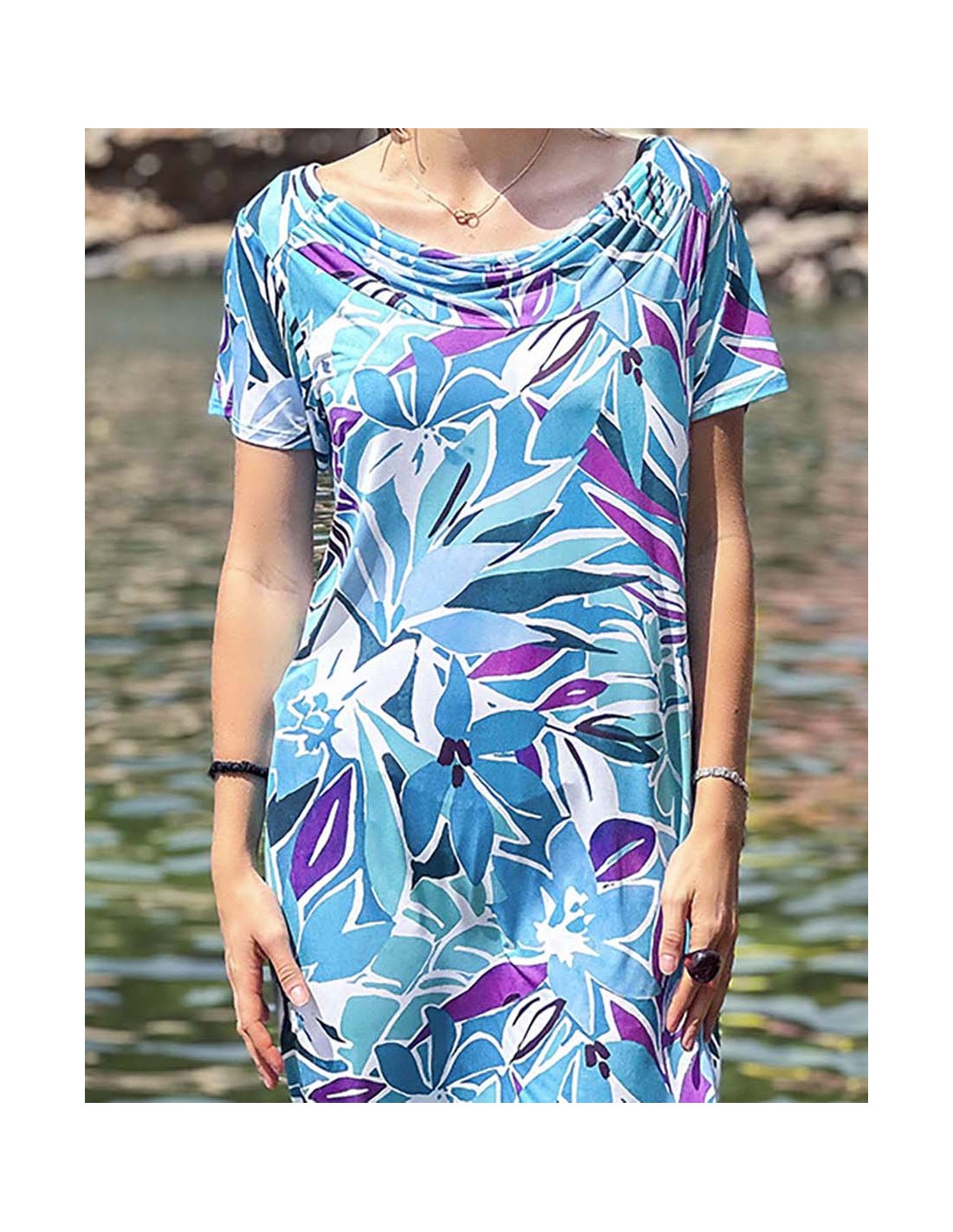 Luce radiante y sofisticada con este vestido de estampado floral en tonos turquesa, morado y blanco, perfecto para quienes buscan comodidad sin renunciar al estilo. Su diseño de corte recto y escote drapeado le da un toque femenino y delicado que favorece cualquier figura.