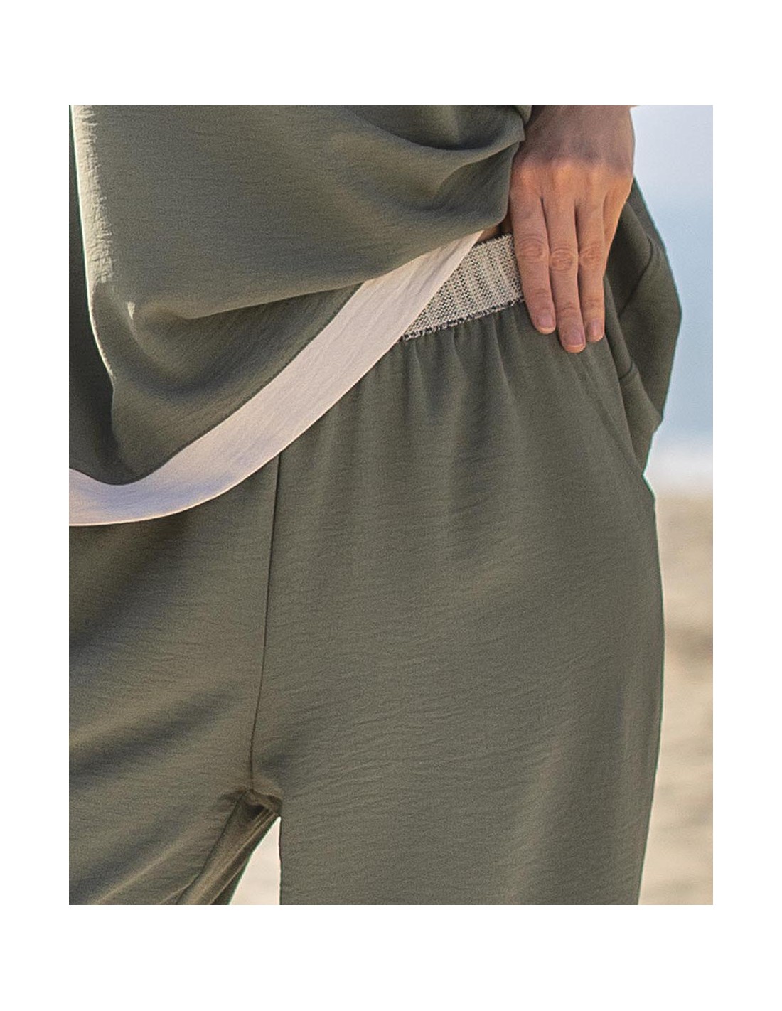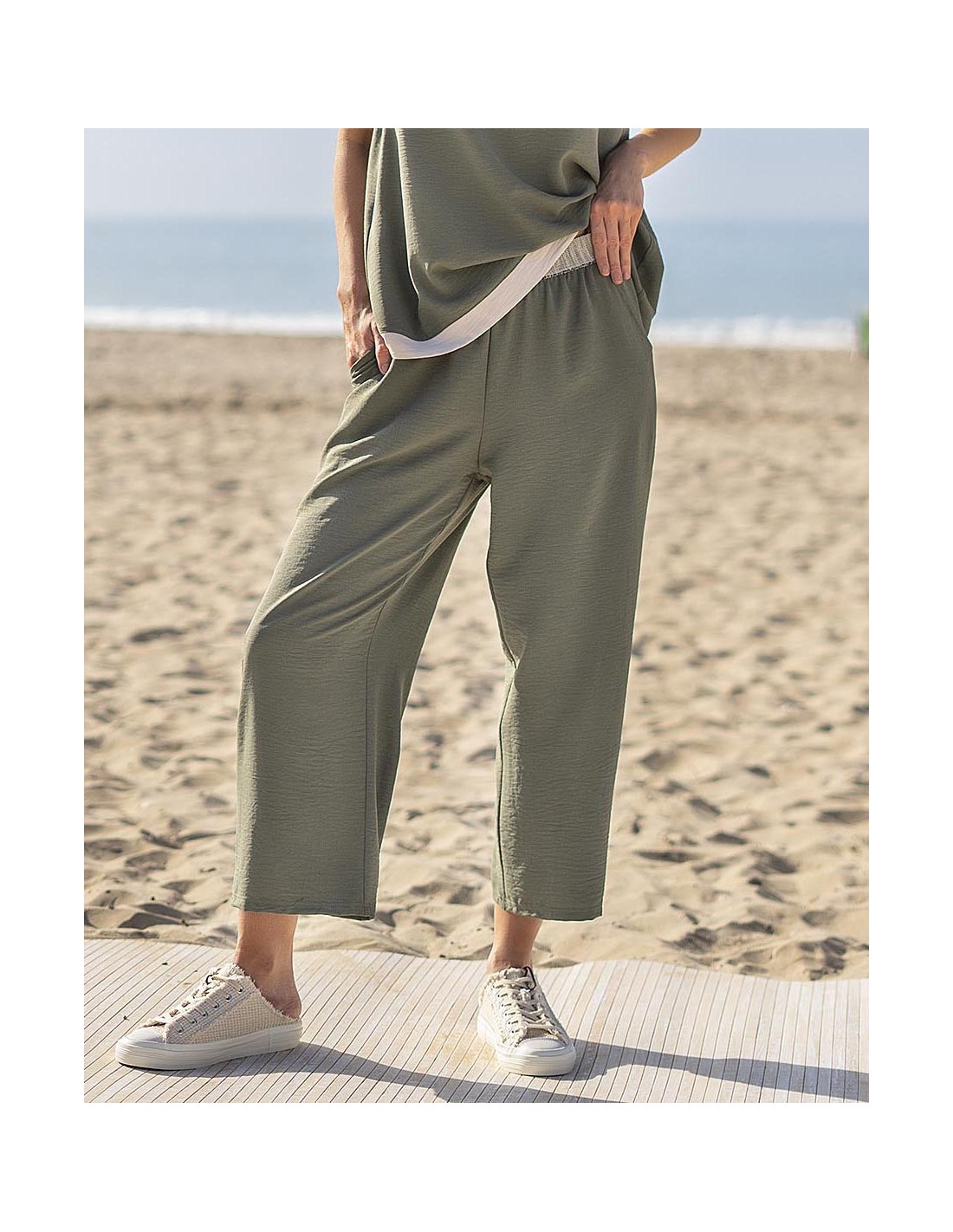 Pantalón tejido liso de plana lergo 3/4 abacado con bolsillos y cintura ancha de goma elástica fantasía
