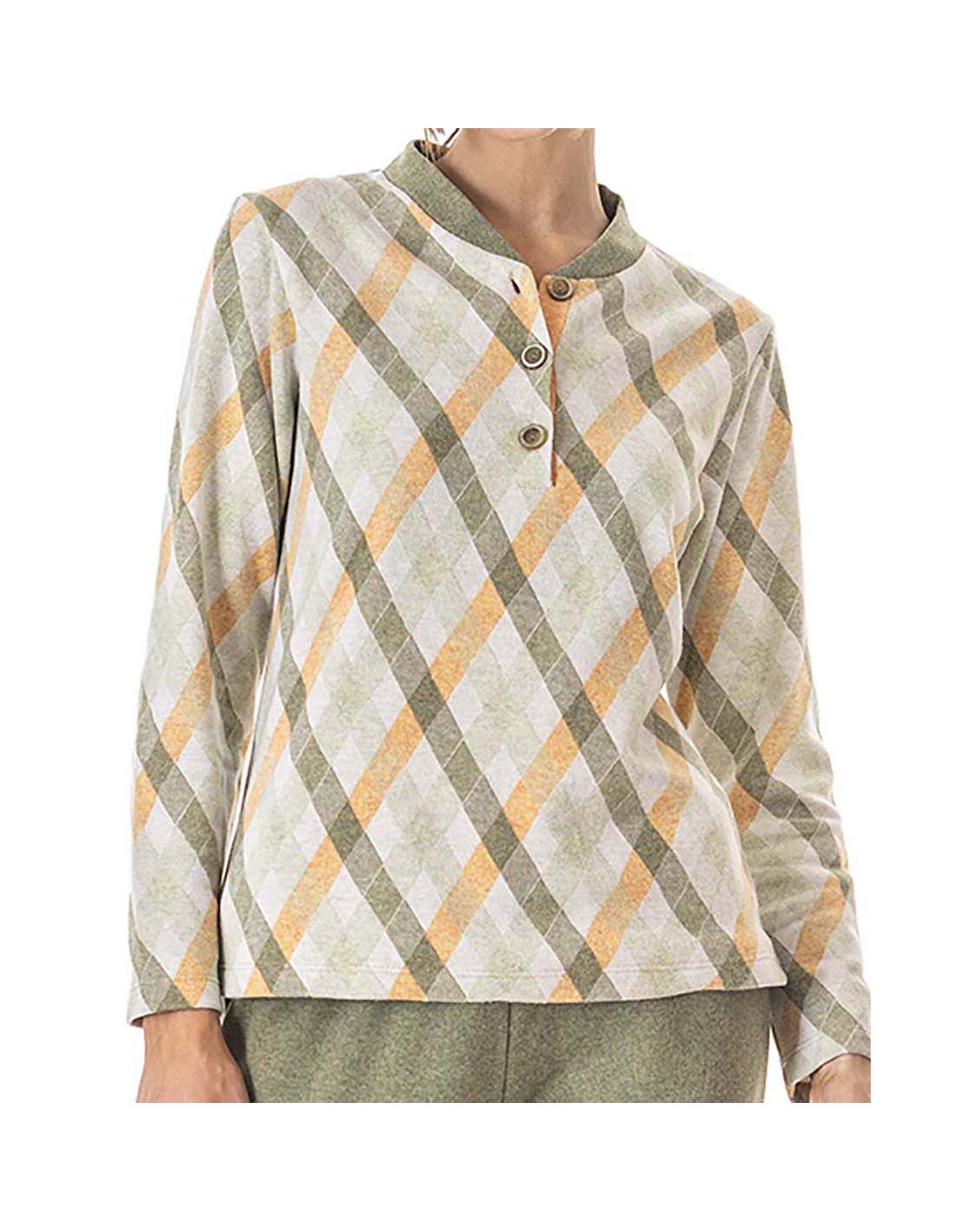 Ce pyjama allie confort et style, idéal pour dormir ou se détendre à la maison. Le haut en maille Milano présente un col rond, une patte de boutonnage et un imprimé à carreaux en diagonale aux tons chauds et doux, lui conférant un style classique et douillet. L'ensemble comprend un pantalon uni à coupe droite, dont la teinte s'harmonise parfaitement avec le haut. Ce pyjama est le choix idéal pour celles qui recherchent un look confortable et élégant pour leurs moments de détente.