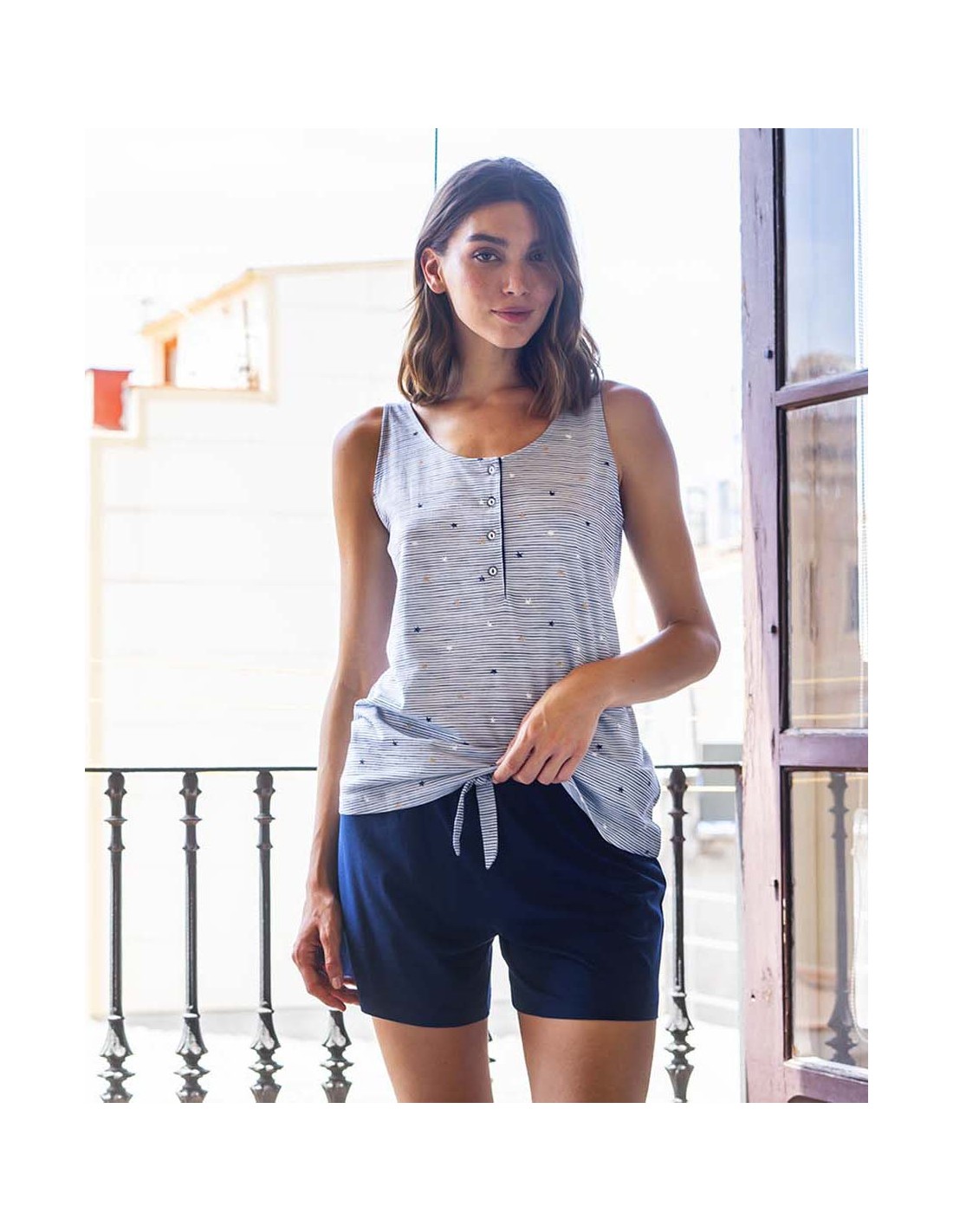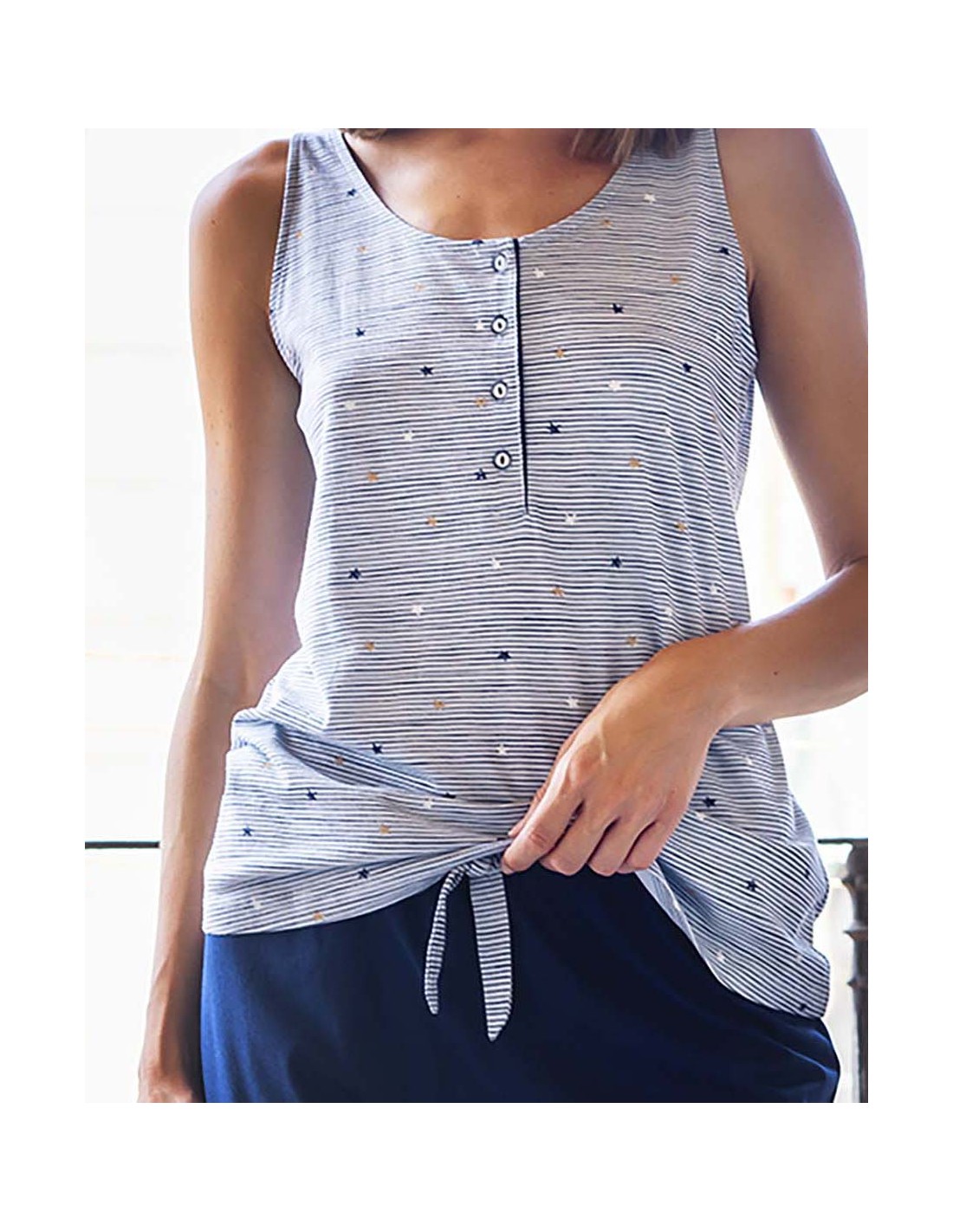 Pijama estampado en tonos azules sobre fondo jeans.Confeccionado en algodón modal, este pijama ofrece una comodidad excepcional y un tacto suave. Presenta una tapeta con botones en la parte frontal , aportando funcionalidad y estilo.Camisa con tirantes proporcionan una apariencia fresca y cómoda.Pantalón corto liso y bolsillos Ideal para usar en casa durante las noches o para momentos de relajación, combinando estilo y confort.