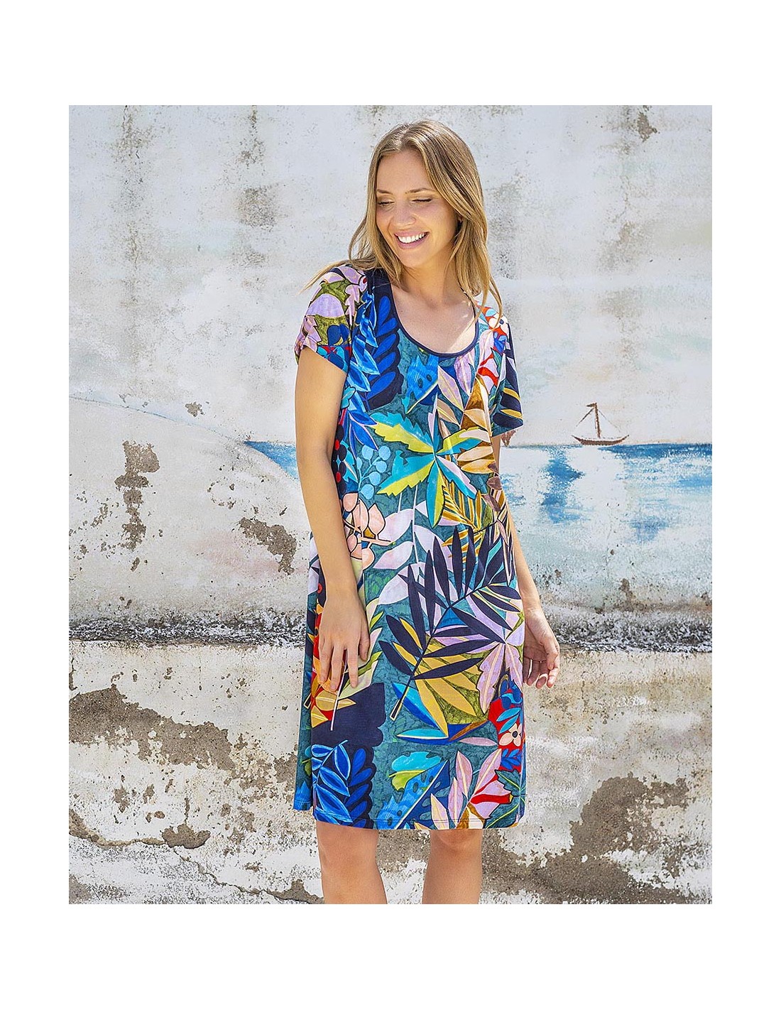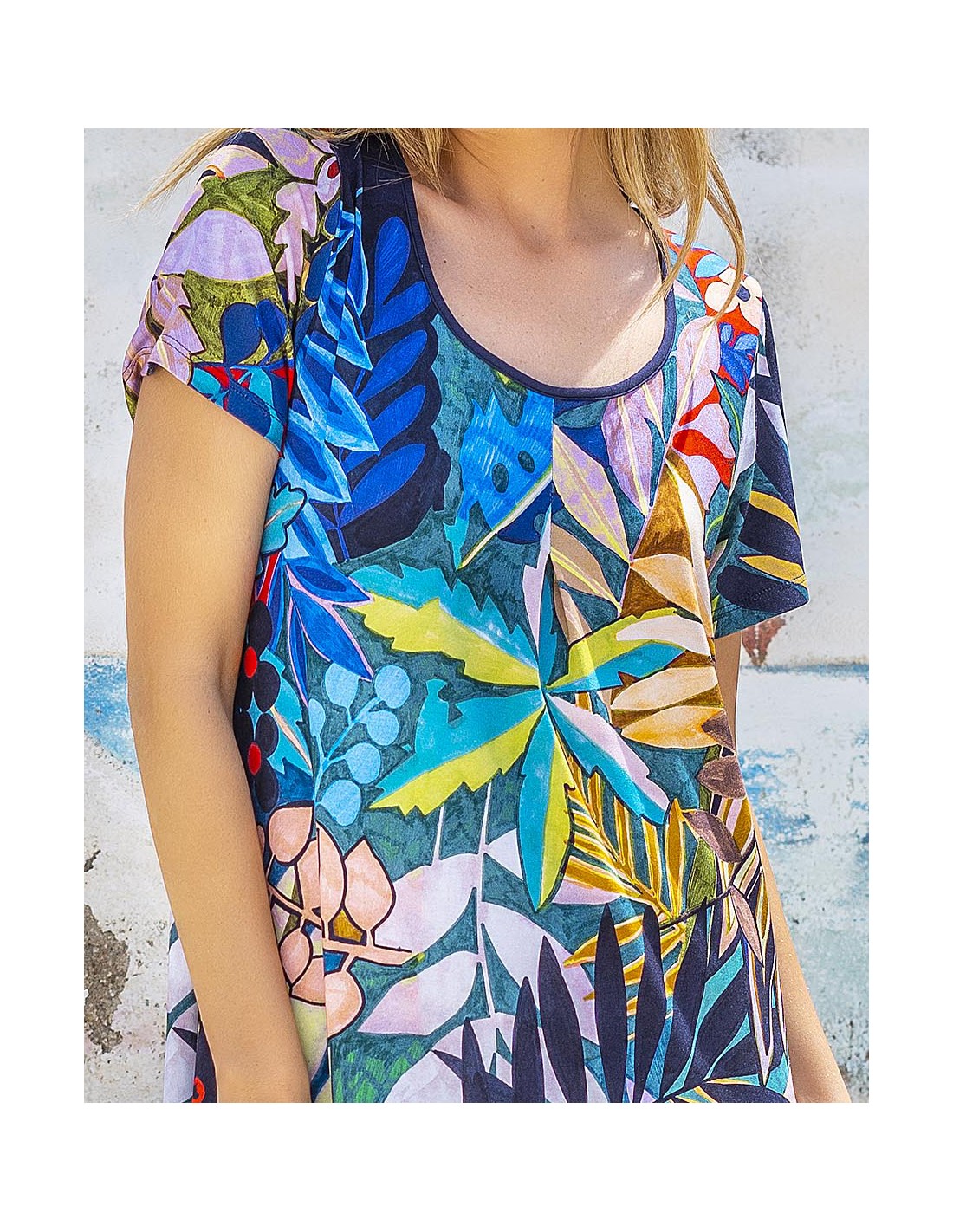 Vestido estampado manga corta con pliegue en escote y vivo contraste liso, largo 1mts.