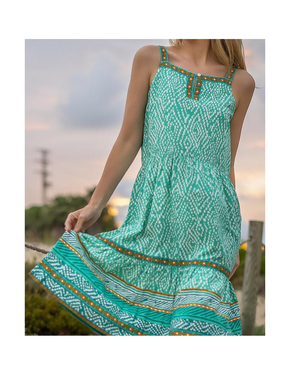 Vestido de corte easy fit confeccionado con tejido de viscosa estampado color fresco menta,con tirantes, escote cuadrado y falda voluminosa con volantes.